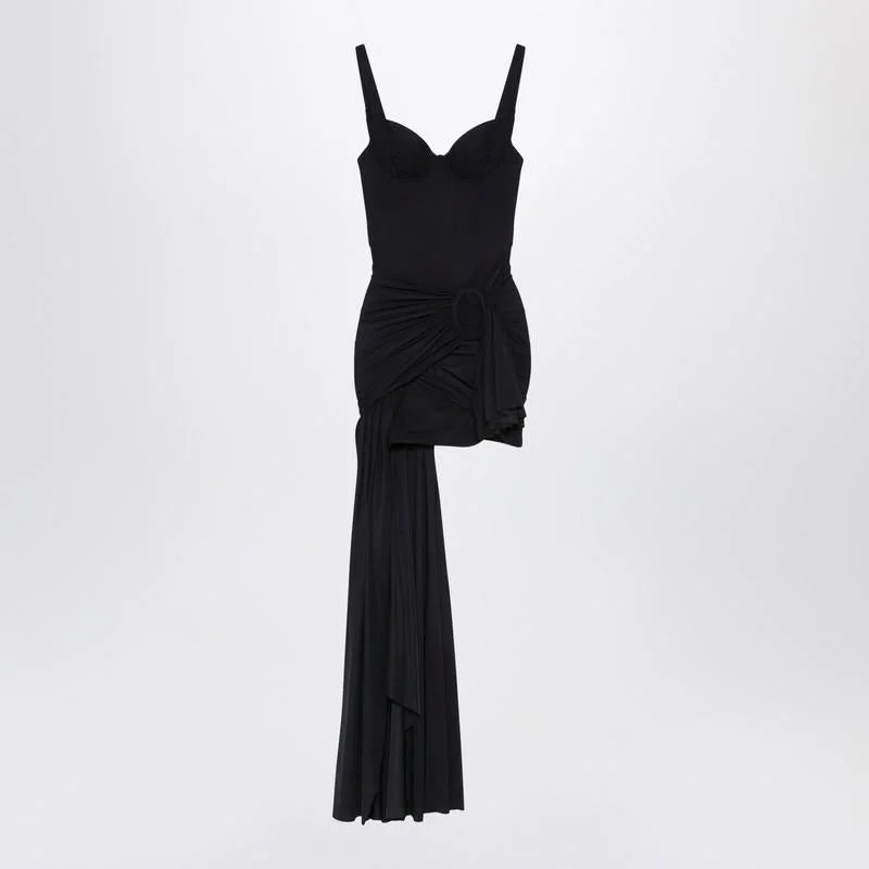 Balenciaga mini dress in matte black jersey featuring a swimsuit-inspired design, open back, draped panels with tone-on-tone buckle, long front panel on the right side, and adjustable straps. Gender: Women Material: 100% Cotton Color: Black Made in: Italy Product ID: 850640TTV27/R_BALEN-1000 *Import tax/duty will be calculated at checkout (If applicable)