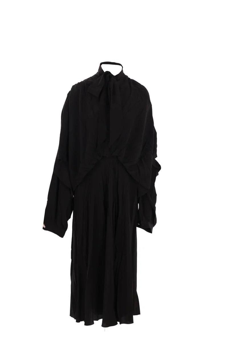 Balenciaga midi dress crafted from black silk with a crinkled effect. Featuring a scarf collar, front closure with covered buttons, side closure with an invisible zipper, long sleeves with cut-outs, buttoned cuffs, a flared skirt and an overlapping back panel. Gender: Women Material: T SILK 100% Color: Black Made in: IT Product ID: 814150TRN031000 *Import tax/duty will be calculated at checkout (If applicable)