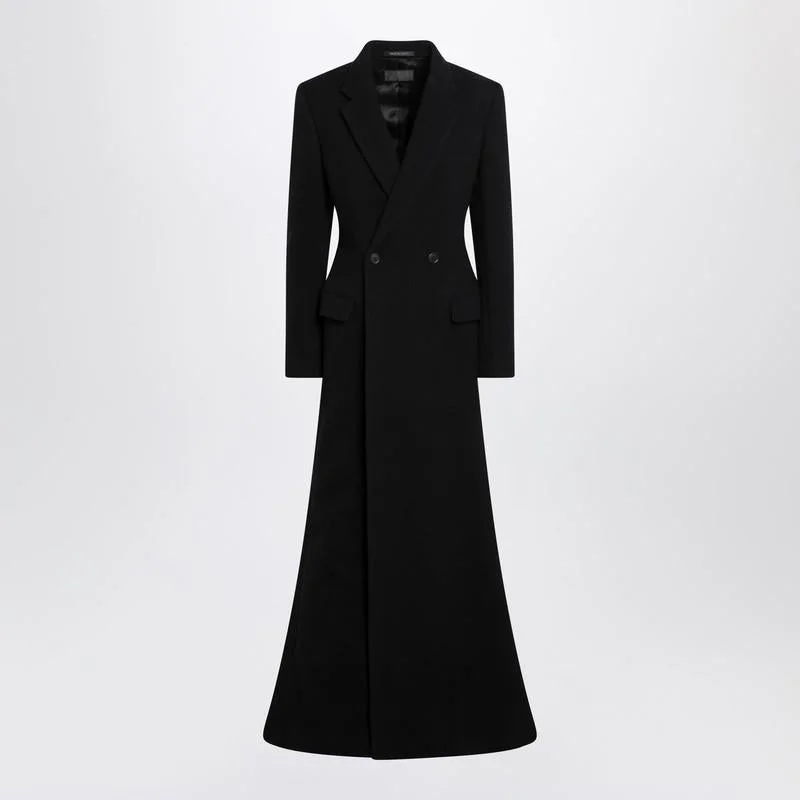Balenciaga double-breasted coat in black wool blend, featuring classic lapels, two front flap pockets, button closure, and floor-length design. Gender: Women Material: Fabric I: 96% Wool - 4% Polyamide / Lining: 100% Cupro Color: Black Made in: Italy Product ID: 850599TTU07/R_BALEN-1000 *Import tax/duty will be calculated at checkout (If applicable)