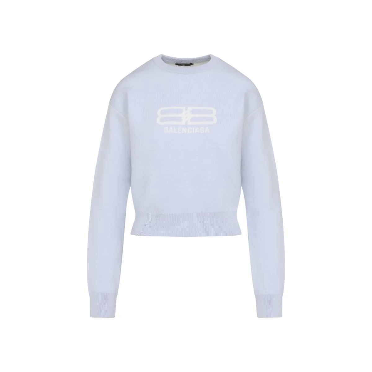 Balenciaga Cropped Light Blue Wool Pullover. Crafted from light blue wool and cotton blend, round neckline, white contrasting logo inlay on the front, dropped shoulders, long sleeves, ribbed edges, cropped. Gender: Women Material: 54%WOOL 42%COTTON 3%POLYAMIDE 1%ELASTANE Color: BLUE Made in: Italy Product ID: 850046.T1760_9076 *Import tax/duty will be calculated at checkout (If applicable)