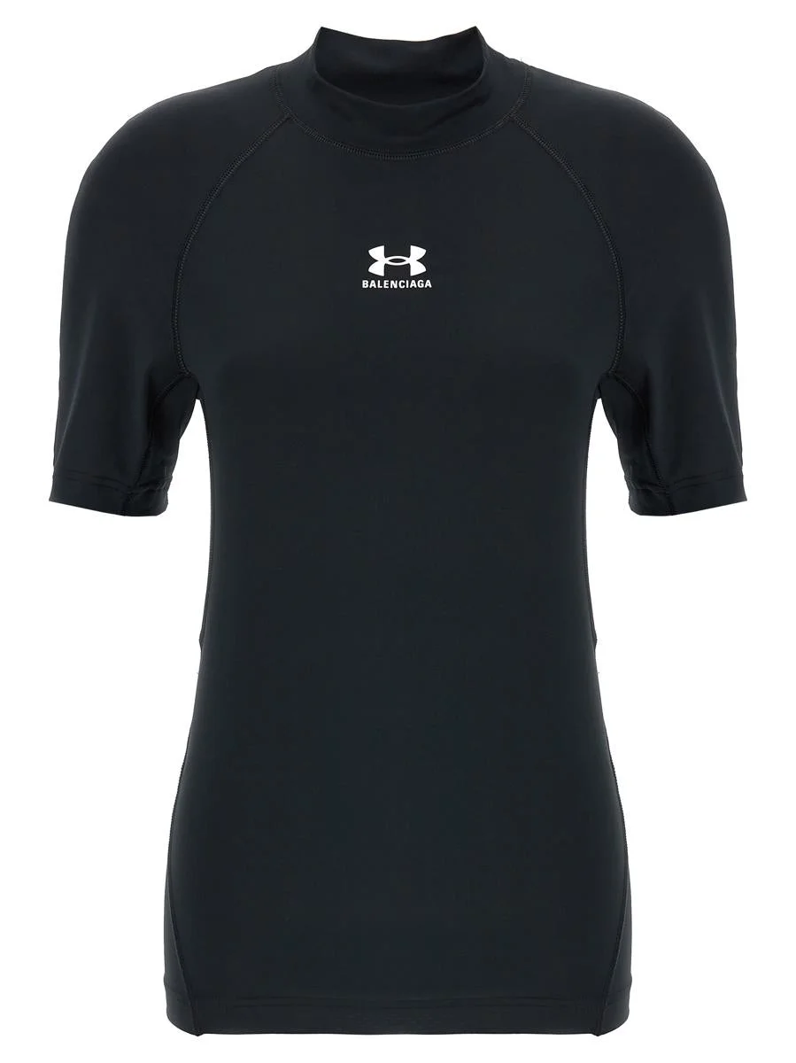 Under Armour® T-shirt in light spandex with logo print on the front and back, mock collar, and short sleeves Gender: Women Material: 85% POLYESTER, 15% ELASTANE Color: Black Made in: Portugal Product ID: 816222TRVY31000 *Import tax/duty will be calculated at checkout (If applicable)