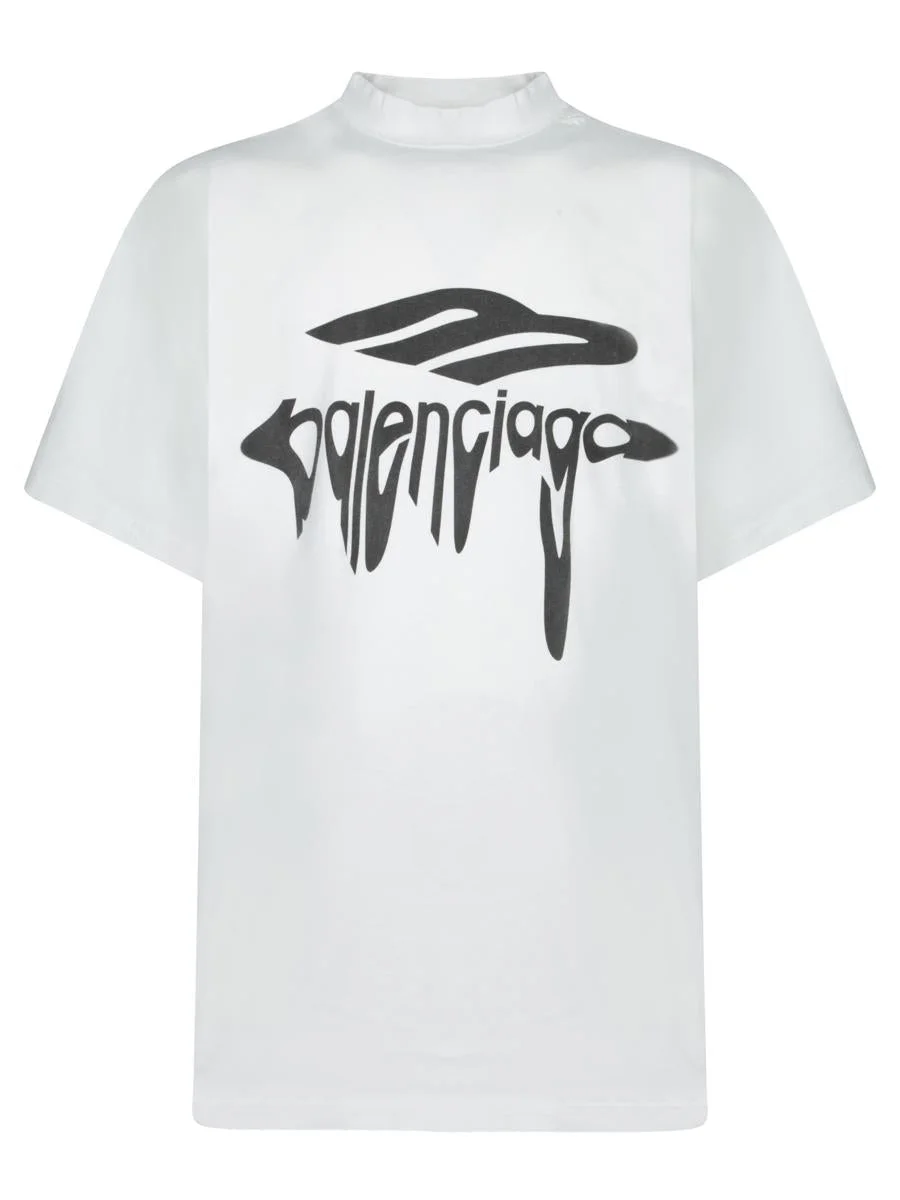 Short sleeve t-shirt, stylized black front logo, crew neck. This Balenciaga T-shirt features a bold black liquid logo on a white base, blending urban sophistication with high fashion in an essential casual garment. Gender: Men Material: 100% COTTON Color: WHITE Made in: Imported Product ID: 787349 TRVS8 9081 *Import tax/duty will be calculated at checkout (If applicable)