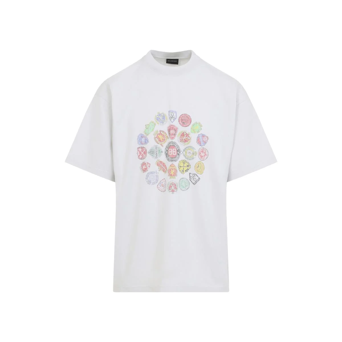 Balenciaga Dirty White Cotton Medium Fit Short Sleeves T-Shirt. Pure dirty white cotton t-shirt, round neck, front multicolor design, back lettering logo, short sleeves, straight hem, tonal stitching. Gender: Men Material: 100%COTTON Color: MULTICOLOR Made in: Portugal Product ID: 764235.TTVH4_9012 *Import tax/duty will be calculated at checkout (If applicable)