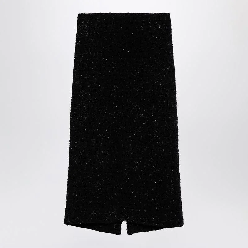 Black cotton blend tweed midi skirt from Balenciaga featuring shiny threads, a rear slit, a back zip fastening and an asymmetric hemline. Gender: Women Material: Fabric I: 73% Cotton - 24% Polyamide - 2% Viscose - 1% Elastane / Lining: 87% Polyester - 13% Elastane Color: Black Made in: IT Product ID: 793601T3328/P_BALEN-1000 *Import tax/duty will be calculated at checkout (If applicable)
