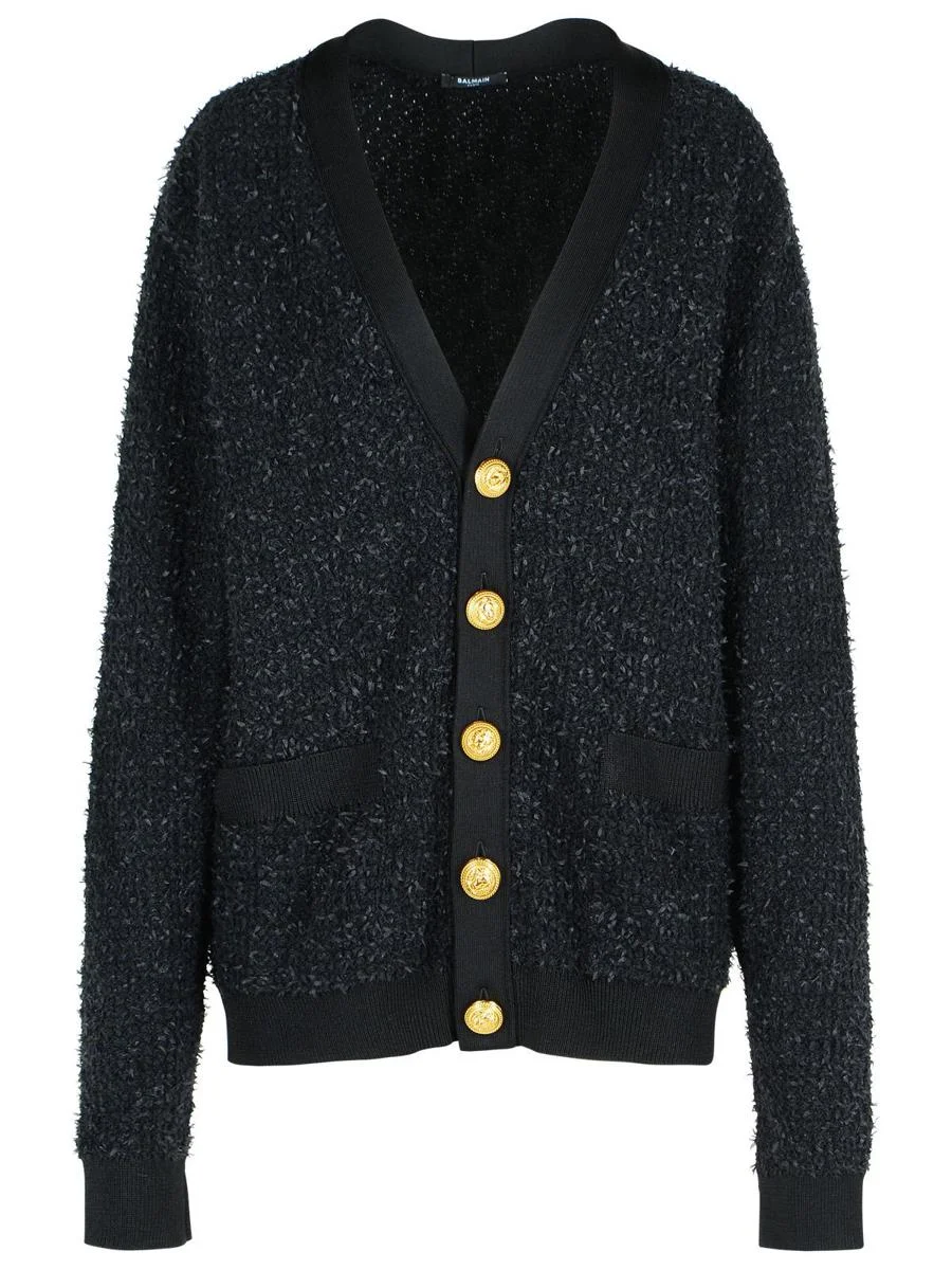 V-neck, front button closure, decorative front pockets, ribbed hem and cuffs Gender: Men Material: 39% viscose, 33% cotton, 27% nylon, 1% elastane Color: Black Made in: Imported Product ID: FH1KL080KI750PA *Import tax/duty will be calculated at checkout (If applicable)