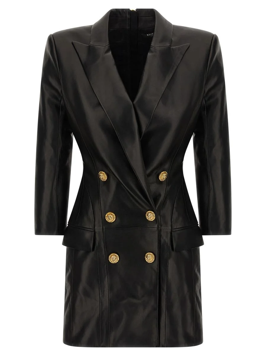 Leather mini dress with double-breasted blazer style, peak lapels, flap pockets, padded shoulder strap, long sleeves, and back zipper closure Gender: Women Material: 100% LAMB LEATHER (OVIS ARIES) Color: Black Made in: Imported Product ID: FF0R9391LD630PA *Import tax/duty will be calculated at checkout (If applicable)