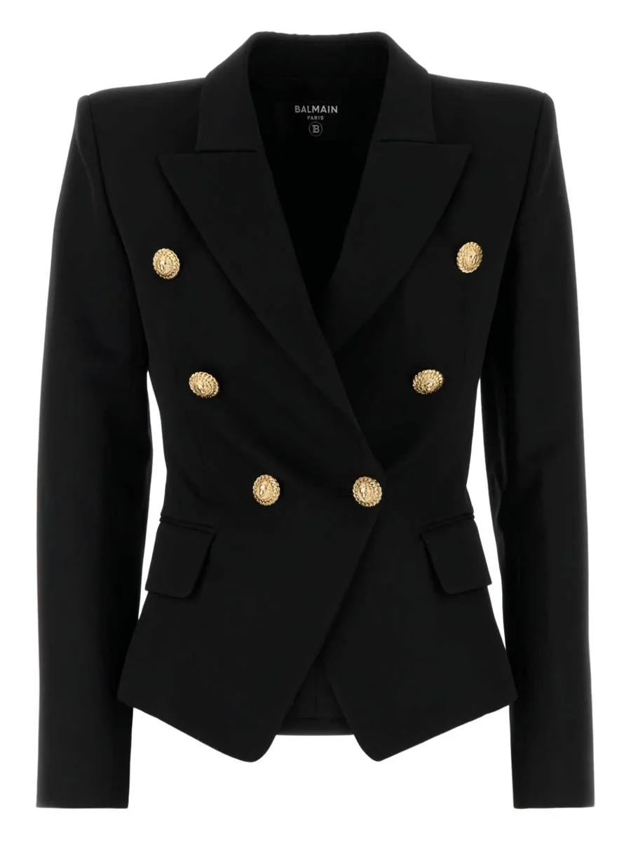 Balmain Six-button wool jacket Italian tailored collar Structured shoulders Long sleeves Gender: Women Material: 100%VIRGIN WOOL Color: Black Made in: Portugal Product ID: FF1SI505WB080PA *Import tax/duty will be calculated at checkout (If applicable)