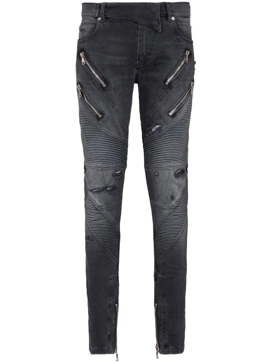 These Balmain biker-style jeans are made of black stretch denim with distressed details. This slim-fit, low-waisted model features a five-pocket design embellished with zip pockets and decorative zippers, as well as panel construction highlighted by stitching. It has a hidden zip closure and snap button waistband, belt loops, and zippered cuffs. Gender: MEN Material: 98%COTTON 2%ELASTANE Color: BLACK Made in: IT Product ID: DH1MG110DE68 0PC *Import tax/duty will be calculated at checkout (If applicable)