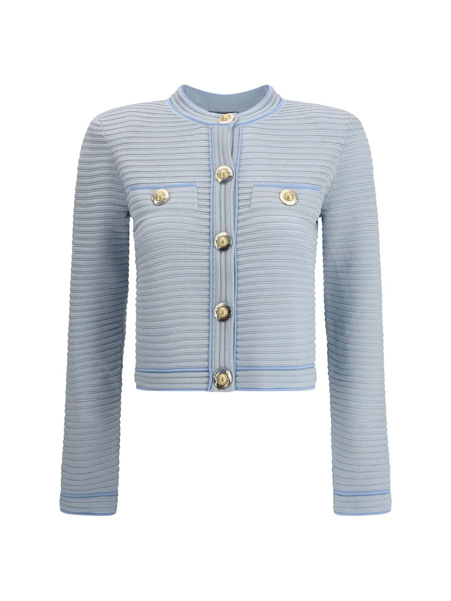 BALMAIN'S CARDIGAN IS A GARMENT WITH A STRUCTURED DESIGN AND REFINED ELEGANCE. THE FRONT CLOSURE WITH FIVE SNAP BUTTONS IS PAIRED WITH TWO TROMPE-L'ŒIL POCKETS ENRICHED WITH DECORATIVE METAL "GOLD AND GOLD COIN" BUTTONS, THE MAISON'S DISTINCTIVE SIGNATURE. BEADED TRIMS DEFINE THE STRAIGHT-FIT SILHOUETTE, WHILE STRUCTURED SHOULDERS AND LONG SLEEVES LEND A BOLD AND SOPHISTICATED TOUCH. RTW FR Gender: Women Material: VISCOSE | POLYESTER | POLYAMIDE Color: BLUE Made in: Italy Product ID: FF1KL240KI83_SOM *Import tax/duty will be calculated at checkout (If applicable)