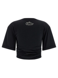 Cotton cropped t-shirt with asymmetrical hem knotted at the front, round neckline, side curls, short sleeves with turn-up on the sleeve bottom and dropped shoulders, metal 'Testa di leone' button detail on the left shoulder, and back logo print Gender: Women Material: 100% COTTON Color: Black Made in: Portugal Product ID: FF0EE012GF23EDY *Import tax/duty will be calculated at checkout (If applicable)