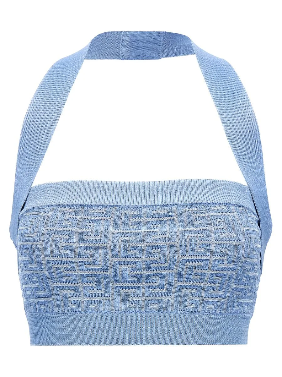 Shiny knit top with labyrinth PB monogram pattern, snap button closure on the neck, back zip closure, crop style Gender: Women Material: 78% VISCOSE 17% METAL 5% POLYESTER Color: BLUE Made in: FR Product ID: EF1AA025KI02SPB *Import tax/duty will be calculated at checkout (If applicable)