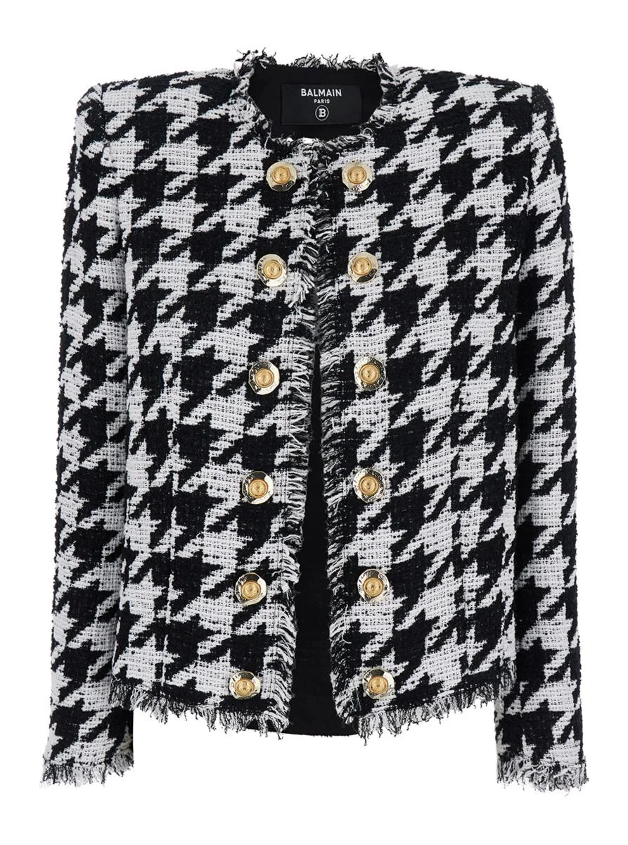 Balmain 'Spencer' Black And White Jacket With All-Over Check Motif And Fringed Hem In Cotton Blend W