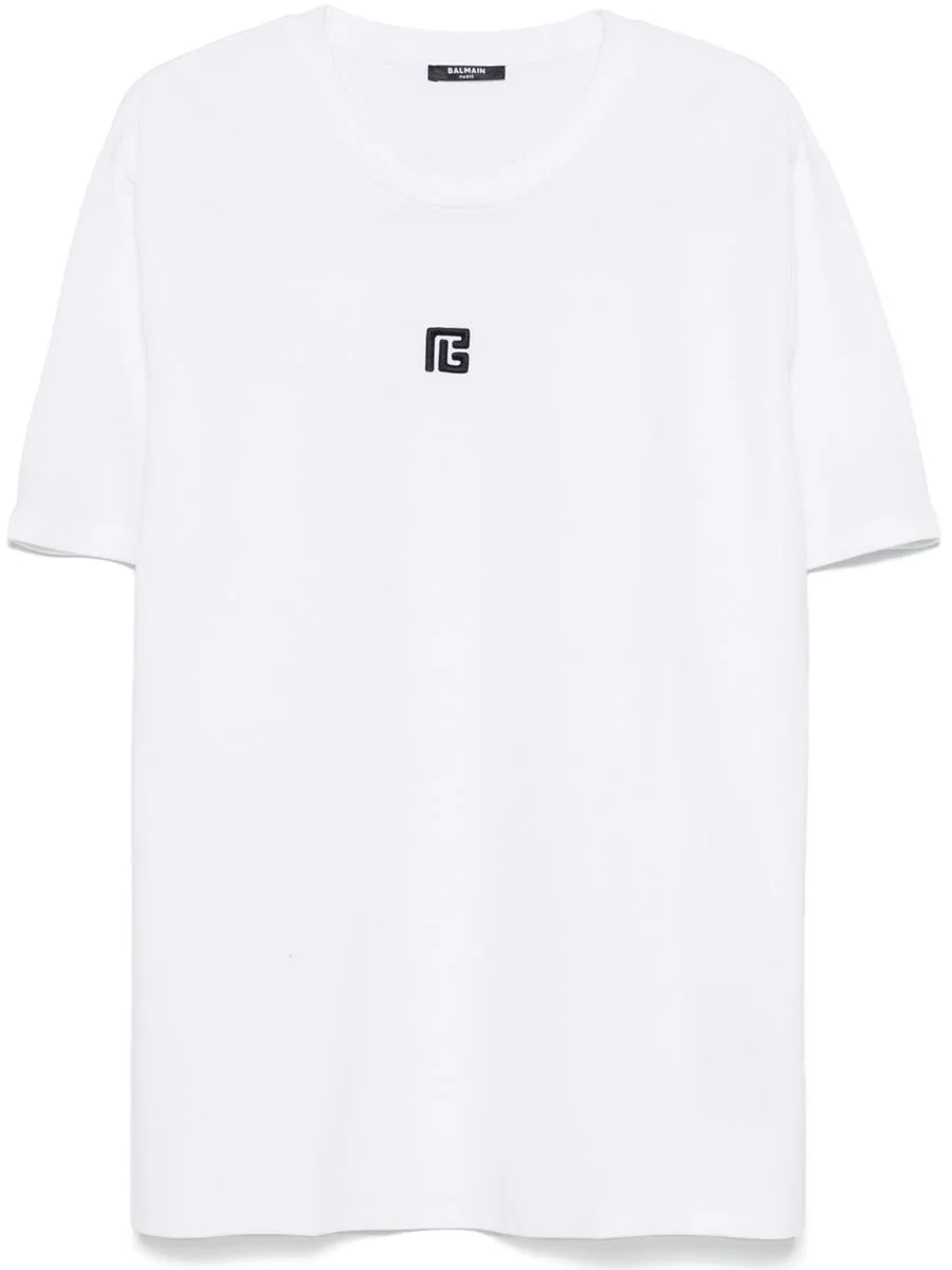 This regular-fit Balmain T-shirt features contrasting PB logo embroidery on the chest for a sophisticated and iconic look. - T-shirt with PB embroidery - Color: white - Round neckline with ribbed finish - Short sleeves - Contrasting embroidered PB logo on the front - Regular fit - Main materials: 39% MD, 39% CO, 12% EA, 10% PA - Item manufactured in Portugal Gender: Men Material: MODAL | 39% MODAL, 39% COTTON, 12% ELASTANE, 10% POLYAMIDE Color: WHITE Made in: PT Product ID: EH1EG010 BC87_GAB BLANC NOIR *Import tax/duty will be calculated at checkout (If applicable)