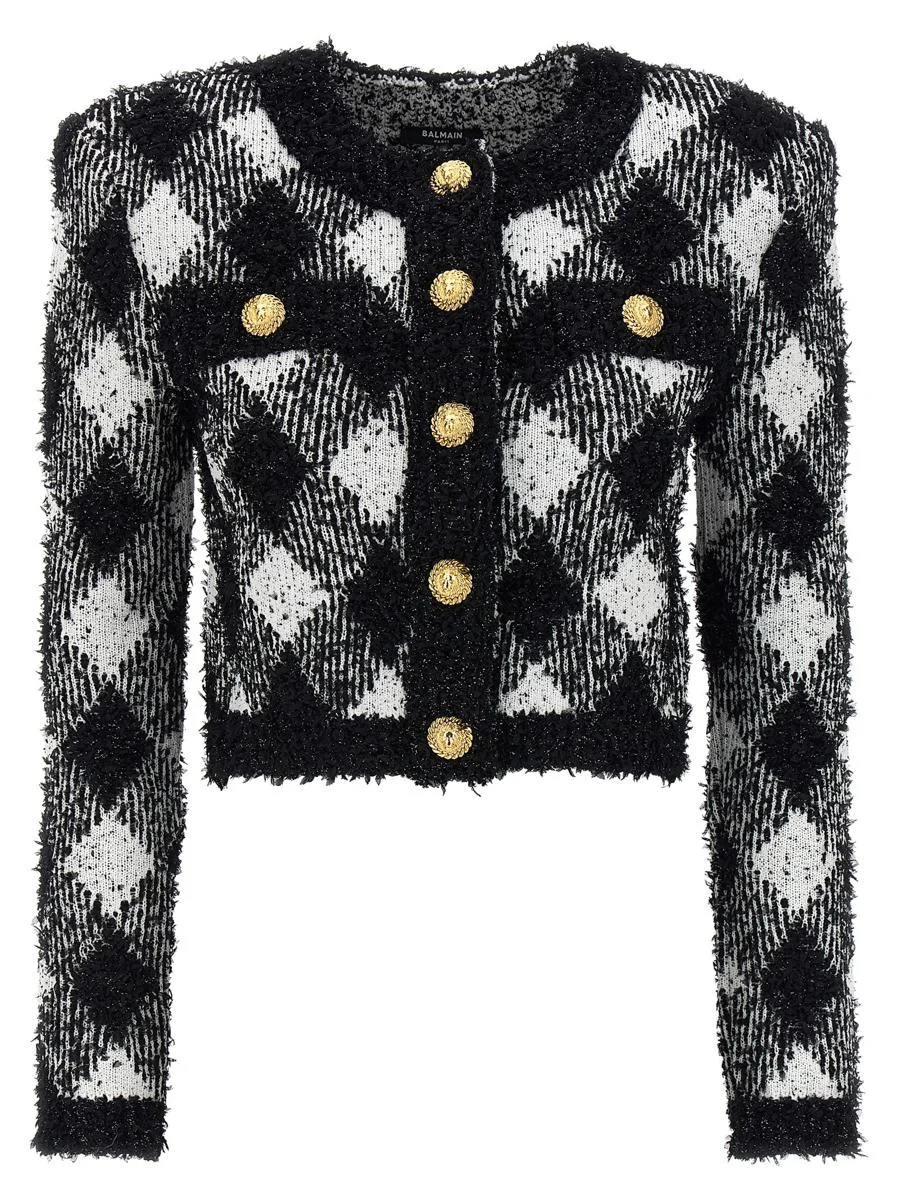 Short jacket in lurex tweed with macro vichy print, crew neck, padded shoulders, long sleeves, gold metal closure and button applique Gender: Women Material: 47% POLYAMIDE 42% VISCOSE 8% POLYESTER 3% MF Color: Multicolor Made in: FR Product ID: DF0SK248KH66EAB *Import tax/duty will be calculated at checkout (If applicable)
