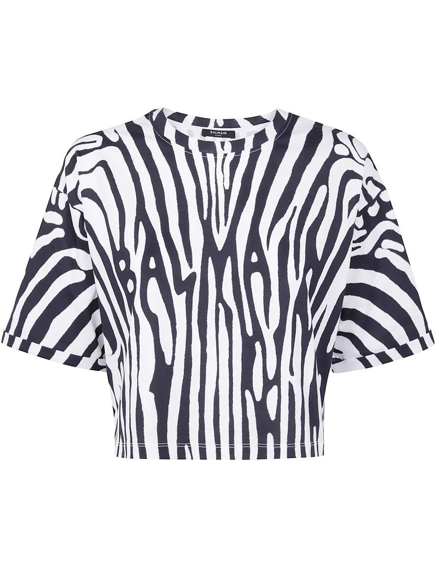 Balmain Zebra Print Crop T-Shirt Clothing Gender: Women Material: ORGANIC COTTON | 100% ORGANIC COTTON Color: Black Made in: Imported Product ID: FF0EE140GF19_ *Import tax/duty will be calculated at checkout (If applicable)