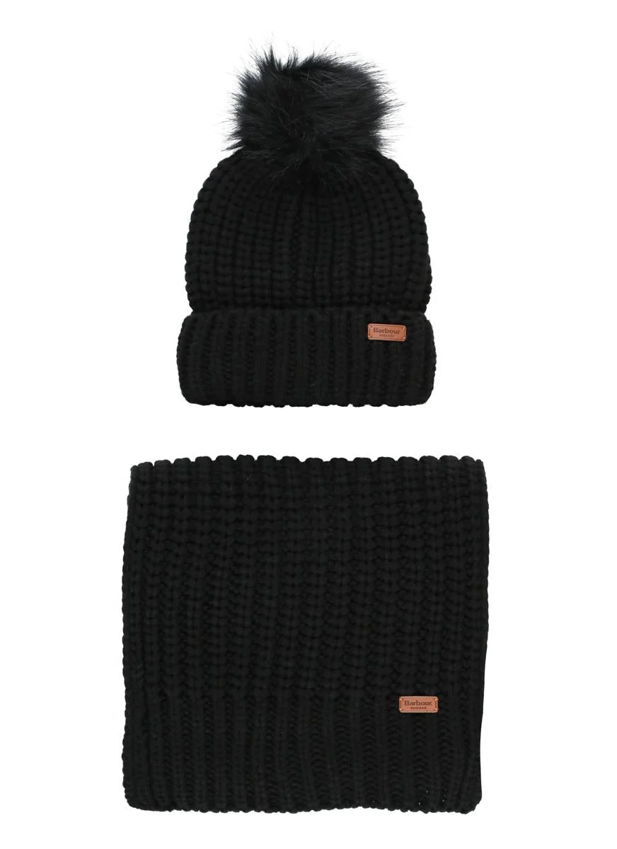 black chunky ribbed knit logo patch to the front pompom detail wraparound style two separate pieces Gender: Women Material: 100% ACRYLIC Color: BLACK Made in: IMPORTED Product ID: LGS0023LGSBK11 *Import tax/duty will be calculated at checkout (If applicable)