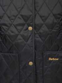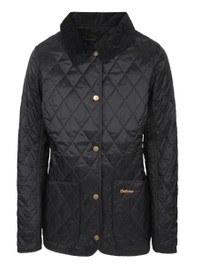 The Annandale Short Jacket by Barbour is a fitted silhouette made of quilted diamond-patterned nylon with a light polyester fiber filling. It features a classic corduroy collar and branded snap button closure, as well as large patch pockets on the sides finished with contrasting logo embroidery. The jacket also has an inner pocket. The model is 177 cm tall and wears a UK size 8. Gender: Women Material: 100% POLYAMIDE, 100% POLYESTER Color: Black Made in: ID Product ID: LQU0475 BK91 *Import tax/duty will be calculated at checkout (If applicable)
