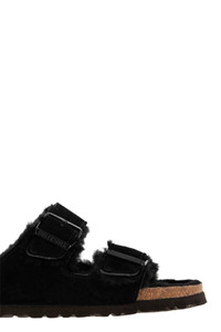 The much-loved BIRKENSTOCK Arizona classic in high-quality genuine suede is shown here in a particularly comfortable and soft version. Warm feet in style thanks to the natural lamb fur in the insole and lining of the straps. The ideal shoe for cosy winter evenings in front of the fireplace! - Anatomical cork and latex footbed - Upper: suede leather with lamb fur lining - Insole: lamb fur - Outsole: EVA - Strap with lamb fur lining - Narrow fit: Narrower plant for slender feet DESIGNER ID: 752663 BLK Measures: Sole Height: 3 cm Gender: Women Material: UPPER: LEATHER LINING: REAL FUR FROM LAMB SOLE: RUBBER Color: BLACK Made in: DE Product ID: 752663 BLK *Import tax/duty will be calculated at checkout (If applicable)