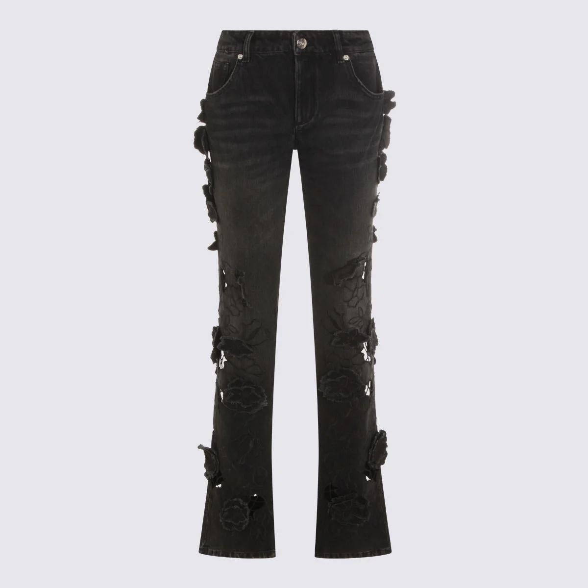 Black cotton jeans from Blumarine featuring belt loops, zip and button fastening, cut out, floral embellishments and regolar vestibility. Size Type: Woman IT Gender: Women Material: TISSUE: 100% COTTONTTONTTON; INT. TASCHE: 65% POLYESTER, 35% COTTONTTONTTON; RICAMO: 100% COTTONTTONTTON Color: Black Made in: Imported Product ID: A544J113AN0990 *Import tax/duty will be calculated at checkout (If applicable)