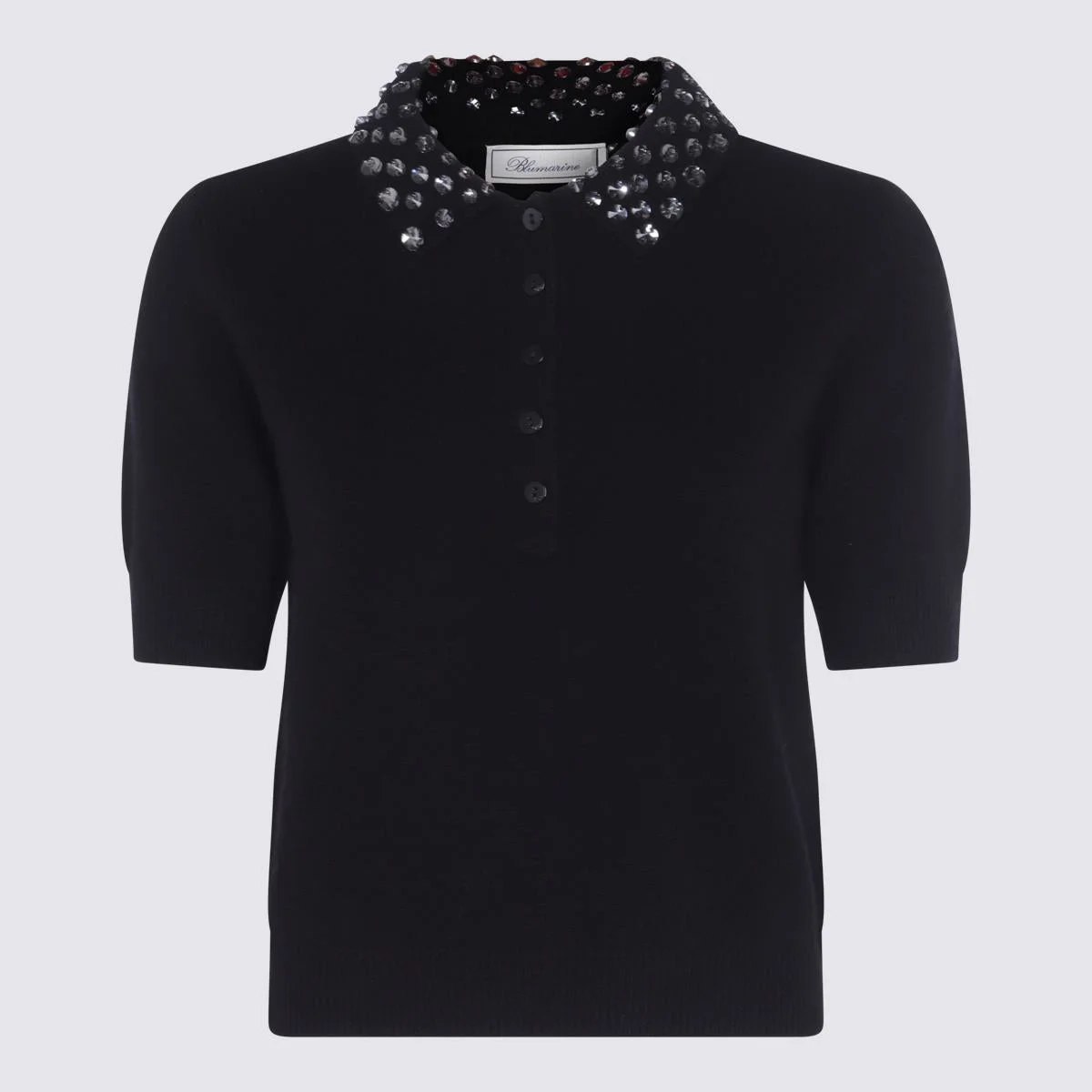 Black wool polo shirt from Blumarine featuring polo shirt collar, short sleeves, rhinestones and regular vestibility. Size Type: AMERICA Gender: Women Material: YARN: 100% WOOL; RICAMO: 100% VE; Color: Black Made in: Imported Product ID: A522M653AN0990 *Import tax/duty will be calculated at checkout (If applicable)