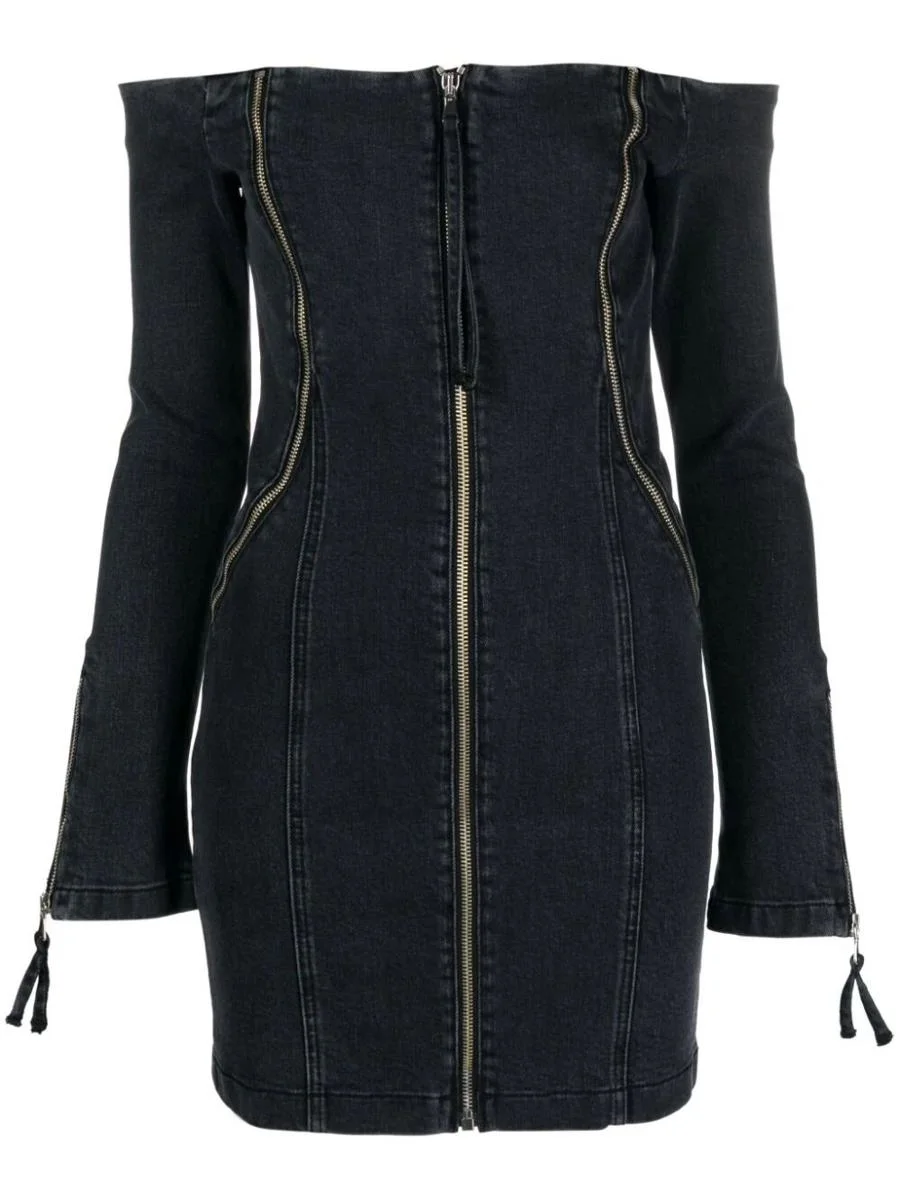 off-shoulder zip-up denim dress