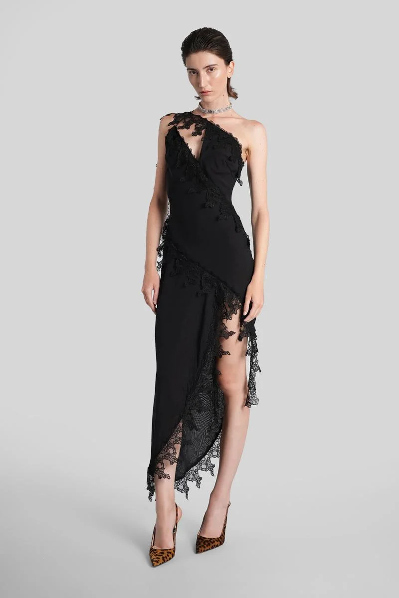 Long dress in black polyester, one shoulder, zip closure, side split, hem embroidery, asymmetrical hem, 100% polyester, Made in Portugal Gender: Women Material: POLYESTER Color: Black Made in: Imported Product ID: 425438_2A674A *Import tax/duty will be calculated at checkout (If applicable)