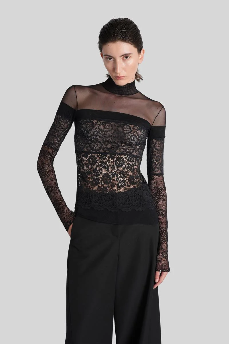Topwear in black polyamide, high collar, floreal lace appliquA¨, semi-sheer panels, straight hem, 85% polyamide, 15% elastan, Made in Italy Gender: Women Material: POLYAMIDE Color: Black Made in: Imported Product ID: 425451_2C409A *Import tax/duty will be calculated at checkout (If applicable)