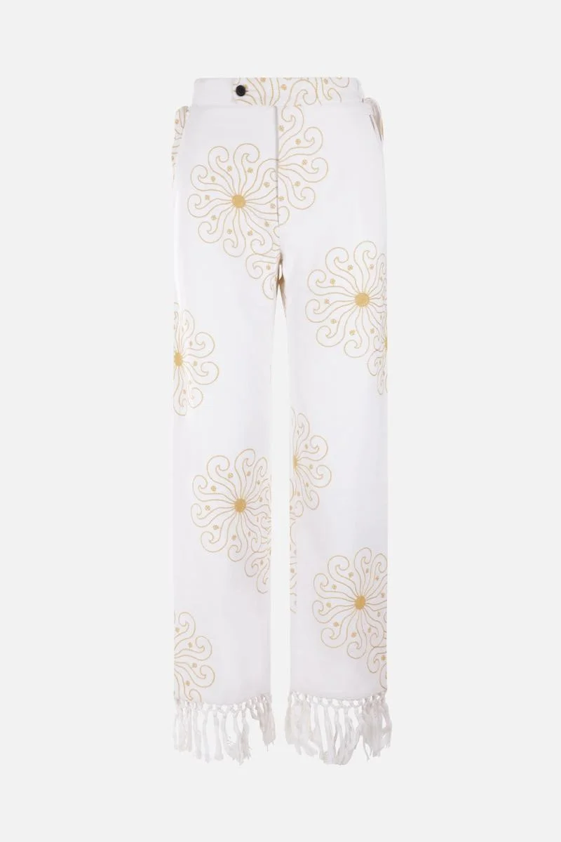 Bode's straight-leg pants inspired by the embroidered tablecloths from the 1950s-1960s and crafted in white cotton canvas with yellow Sunburst stem-stitched embroideries. Featuring button / zip closure, side laces, side slanted pockets, back flap pockets and fringes at hem. Each item is unique: any irregularities or slight variations in weaving are intrinsic characteristics of the fabric. Gender: Women Material: 100% COTTON Color: WHITE Made in: IN Product ID: MRS23BT026WWHITE *Import tax/duty will be calculated at checkout (If applicable)