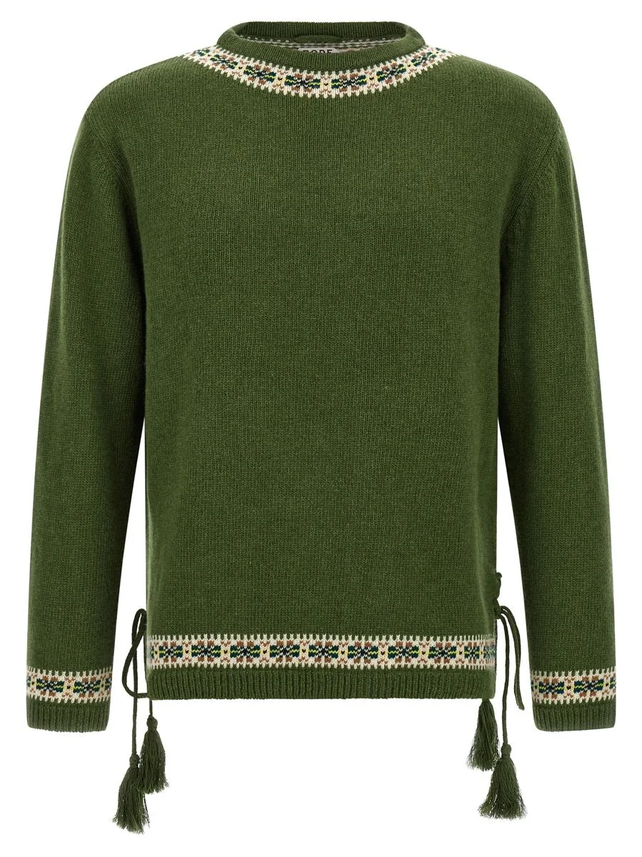 Virgin wool 'Moritz' sweater with jacquard band 'Fair Isle' pattern, crew neck, long sleeves with cuffs and dropped shoulder, side slits with lace and tassel at the end Gender: Men Material: 100% VIRGIN WOOL Color: GREEN Made in: Romania Product ID: MRF25KT004GREENMULTI *Import tax/duty will be calculated at checkout (If applicable)