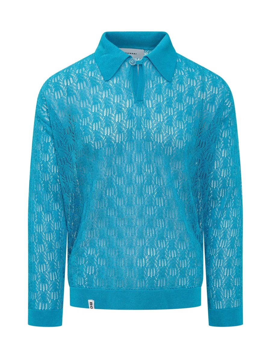Long-sleeved polo shirt. Regular ribbed collar. Button closure. Knit with perforated workmanship. Ribbed cuffs and hem. Blue color. Gender: Men Material: 88% RAYON VISCOSE 12% POLYAMIDE Color: BLUE Made in: IT Product ID: KN001001 AZURE *Import tax/duty will be calculated at checkout (If applicable)