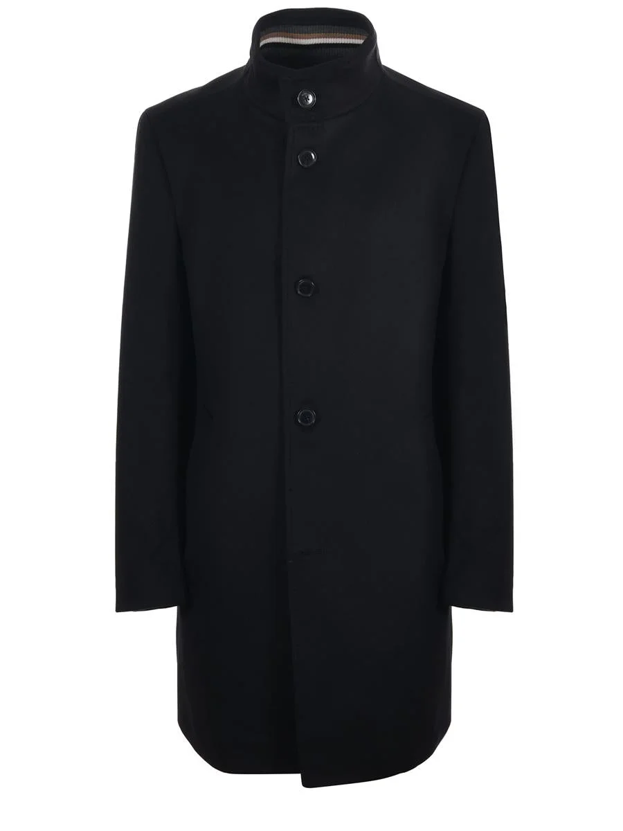 Boss coat in black wool and cashmere blend. Stand-up collar with buttons. Inset pockets. Inside pockets. Lined. Button closure. Back vent. Slim fit. Size shown: 50 Gender: Men Material: LANA E CASHMERE Color: Black Made in: Portugal Product ID: 5055107810273687-001 *Import tax/duty will be calculated at checkout (If applicable)