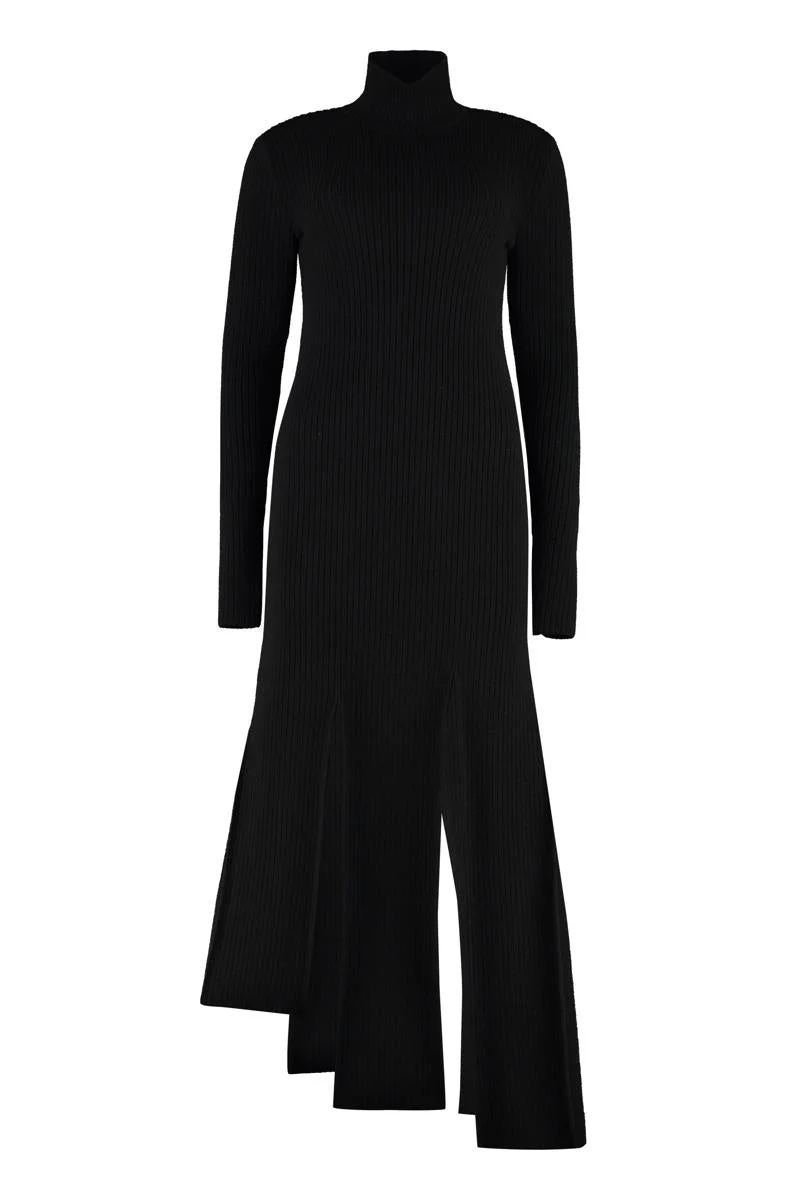 Ribbed knit dress Asymmetric hem with slits 96% Wool, 3% Polyamide, 1% Elastane Gender: WOMEN Material: WOOL Color: BLACK Made in: IT Product ID: 664144V0Z90_1000 *Import tax/duty will be calculated at checkout (If applicable)