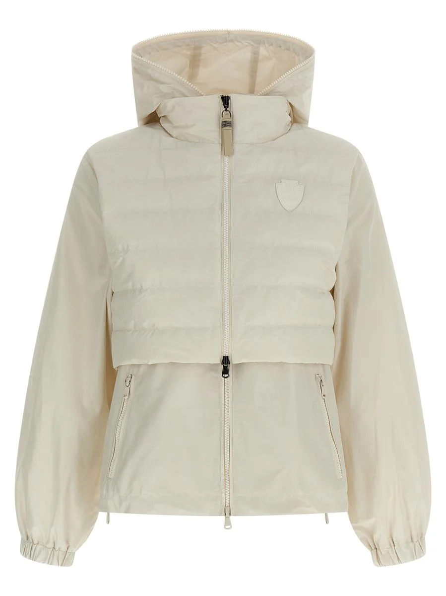 cod. MH5257933C016 2 in 1 water-repellent cotton blend jacket consisting of windbreaker with breathable nylon lining, adjustable hood, front zip closure, pockets, long sleeves with elastic cuffs, drawstring on the hem and quilted and goose feather padded vest, crop model, standing collar, heraldic coat of arms patch of Solomeo and front zip closure. Color: Beige Size & Fit: true to size fit Composition: 54% cotton, 46% polyester Made in: Italy