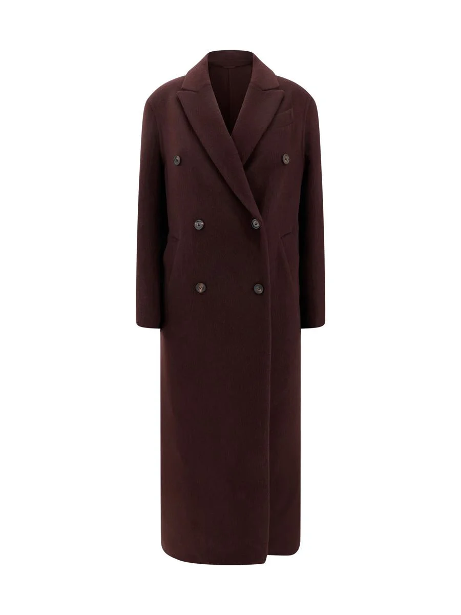 BRUNELLO CUCINELLI'S CASHMERE LONG COAT IS A LUXURIOUS AND SOPHISTICATED PIECE, FEATURING AN ELEGANT PEAKED LAPEL THAT LENDS A CLASSIC AND REFINED TOUCH. THE DOUBLE-BREASTED FRONT BUTTON CLOSURE ADDS STRUCTURE TO THE DESIGN, WHILE THE TWO SIDE WELT POCKETS OFFER PRACTICALITY WITHOUT COMPROMISING ELEGANCE. THE BACK SLIT PROVIDES GREATER FREEDOM OF MOVEMENT AND A SLEEK SILHOUETTE. RTW IT Gender: Women Material: KASHMIR/CAPRA HIRCUS Color: Red Made in: Italy Product ID: MD5039895_C4243 *Import tax/duty will be calculated at checkout (If applicable)