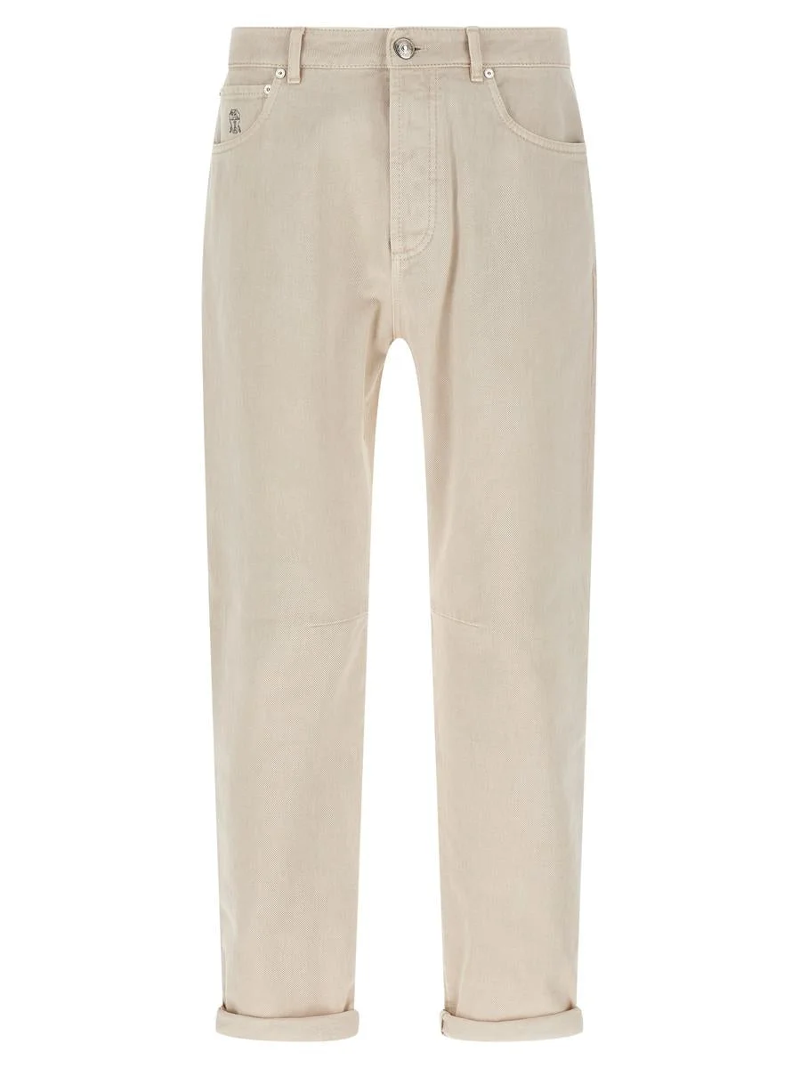 Garment-dyed comfort cotton denim jeans, logo embroidery and front button closure, five pockets, straight leg, side stitching on the knee, back suede logo tag Gender: Men Material: 100% COTTON Color: Beige Made in: Italy Product ID: M237UX1290C7024 *Import tax/duty will be calculated at checkout (If applicable)