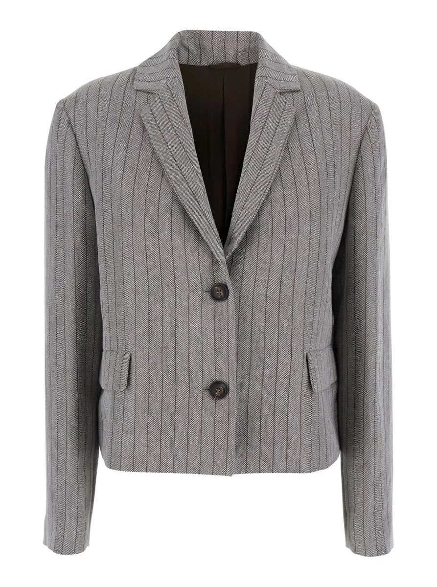 Brunello Cucinelli Grey Jacket With Notched Revers And All-Over Striped Motif In Linen Blend Woman
