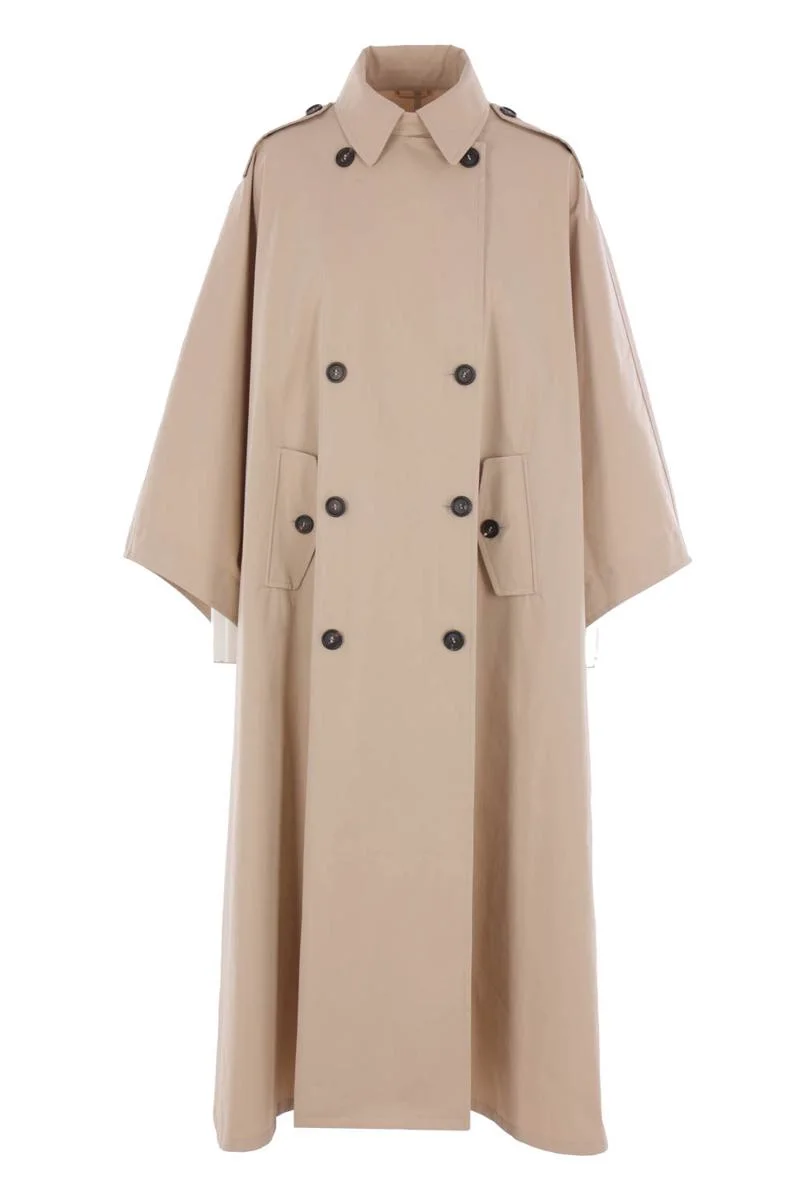 Brunello Cucinelli oversized cape crafted from a beige cotton blend. Featuring a pointed collar, double-breasted button closure, shoulder epaulettes, welt pockets with buttons, side buttoned openings, and a straight hem. Gender: Women Material: 67%COTTON 20%POLYAMIDE 13%POLYURETHANE COTTONLOR BEIGE" Color: Beige Made in: Italy Product ID: MM5399811C6697 *Import tax/duty will be calculated at checkout (If applicable)