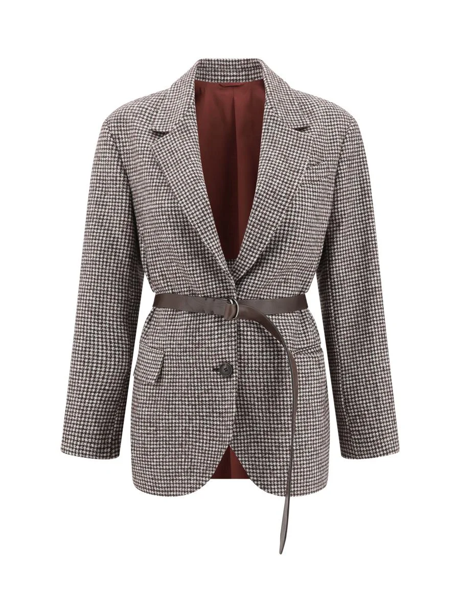 Wool and alpaca houndstooth blazer with leather belt and monili