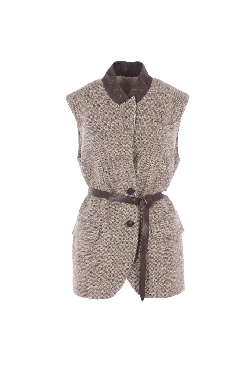 Flecked virgin wool and silk chevron vest with leather belt and monili