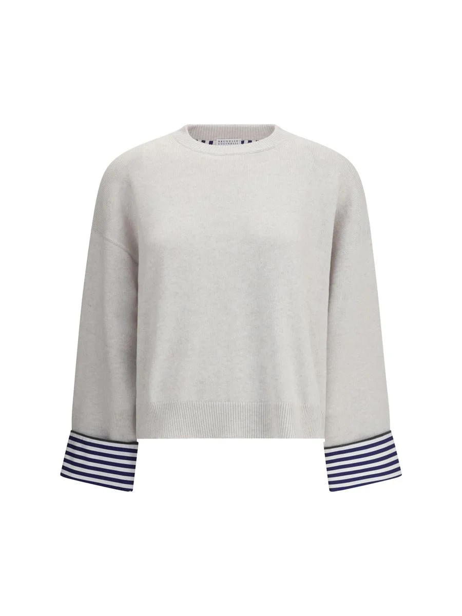 BRUNELLO CUCINELLI'S CASHMERE SWEATER COMBINES THE SOFTNESS OF KNIT WITH REFINED TAILORING DETAILS. FEATURING A RIBBED CREW NECK AND HEMLINE, IT IS DISTINGUISHED BY CUFFS WITH A STRIPED SHIRTING FABRIC INSERT, EMBELLISHED WITH ICONIC SHINY JEWELS. A VERSATILE AND ELEGANT GARMENT THAT STYLISHLY INTERPRETS THE CONCEPT OF UNDERSTATED LUXURY. STANDARD Gender: Women Material: KASHMIR/CAPRA HIRCUS Color: GREY Made in: Italy Product ID: M12709800P_C9610 *Import tax/duty will be calculated at checkout (If applicable)