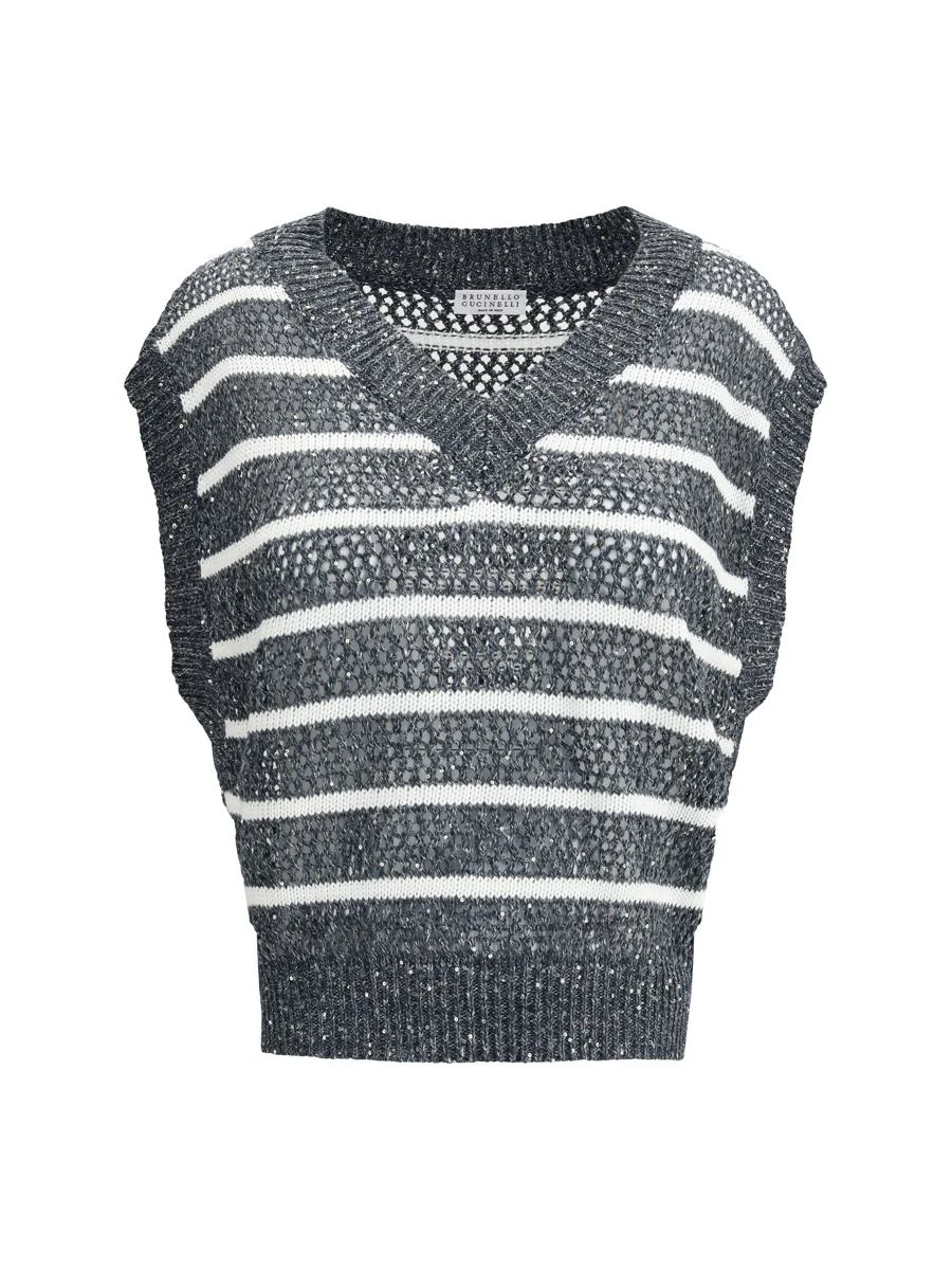 BRUNELLO CUCINELLI'S STRIPED GILET IS A SOPHISTICATED GARMENT THAT COMBINES CRAFTSMANSHIP AND PRECIOUS DETAILS. MADE WITH A LOOSE WEAVE, IT STANDS OUT FOR ITS V-NECKLINE AND RIBBED HEMS, WHICH GIVE STRUCTURE AND DEFINITION TO THE MODEL. THE STRIPED PATTERN IS EMBELLISHED WITH ALL-OVER APPLIED MICRO SEQUINS, WHICH DISCREETLY CATCH THE LIGHT AND ADD A TOUCH OF ELEGANT LUMINOSITY. STANDARD Gender: Women Material: LINEN | NYLON Color: BLUE Made in: Italy Product ID: MCO558902_CAS74 *Import tax/duty will be calculated at checkout (If applicable)