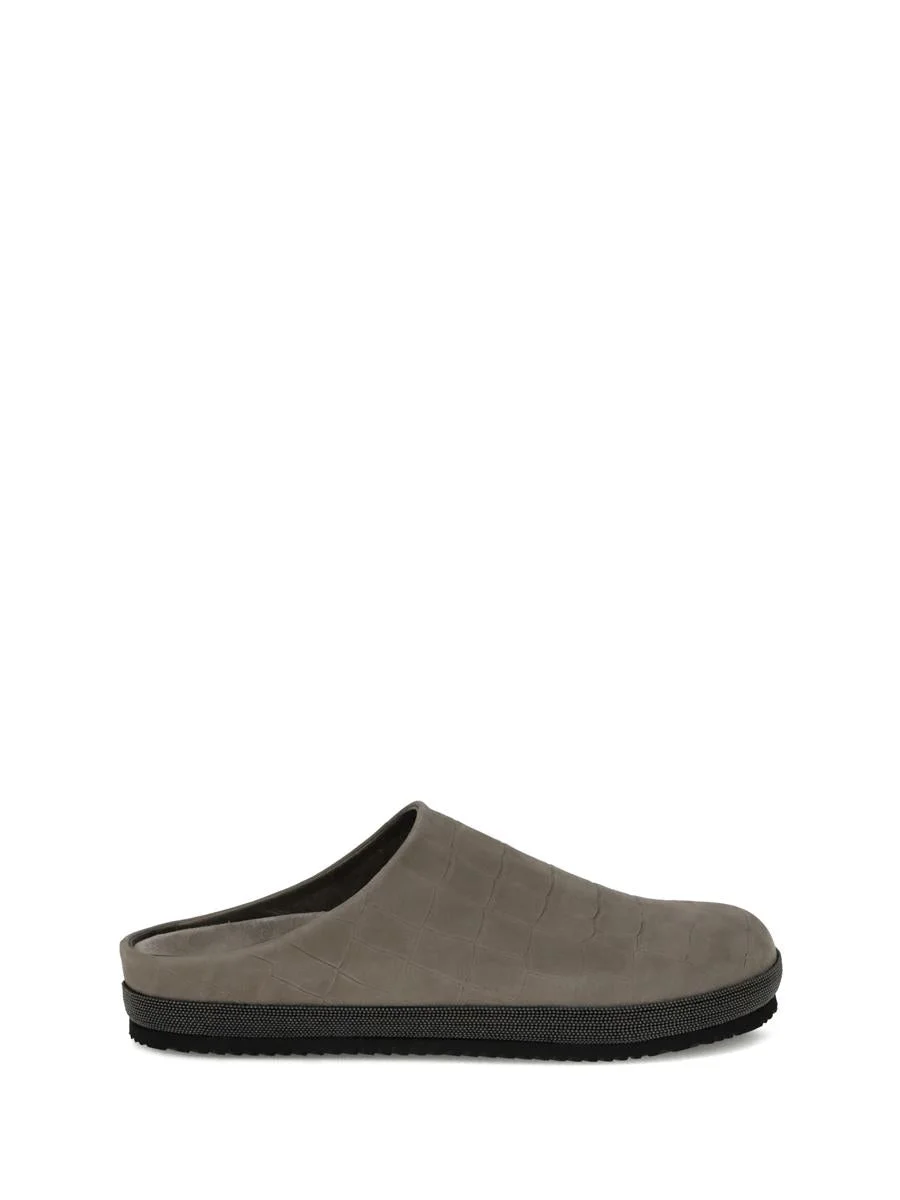 BRUNELLO CUCINELLI'S LEATHER MULES EXPRESS UNDERSTATED ELEGANCE AND CAREFUL CRAFTSMANSHIP. FEATURING A REFINED CROC-EFFECT DESIGN, THEY HAVE A ROUNDED TOE AND A FLAT SOLE DESIGNED FOR MAXIMUM COMFORT. THE DISTINCTIVE TOUCH IS GIVEN BY THE INSERTS OF ICONIC SHINY JEWELS ALONG THE PROFILES, WHICH ILLUMINATE THE SILHOUETTE WITH UNDERSTATED SOPHISTICATION. SHOES IT Gender: Women Material: RUBBER | CALF LEATHER BOS TAURUS Color: GREY Made in: Italy Product ID: MZDCG3040P_C3983 *Import tax/duty will be calculated at checkout (If applicable)