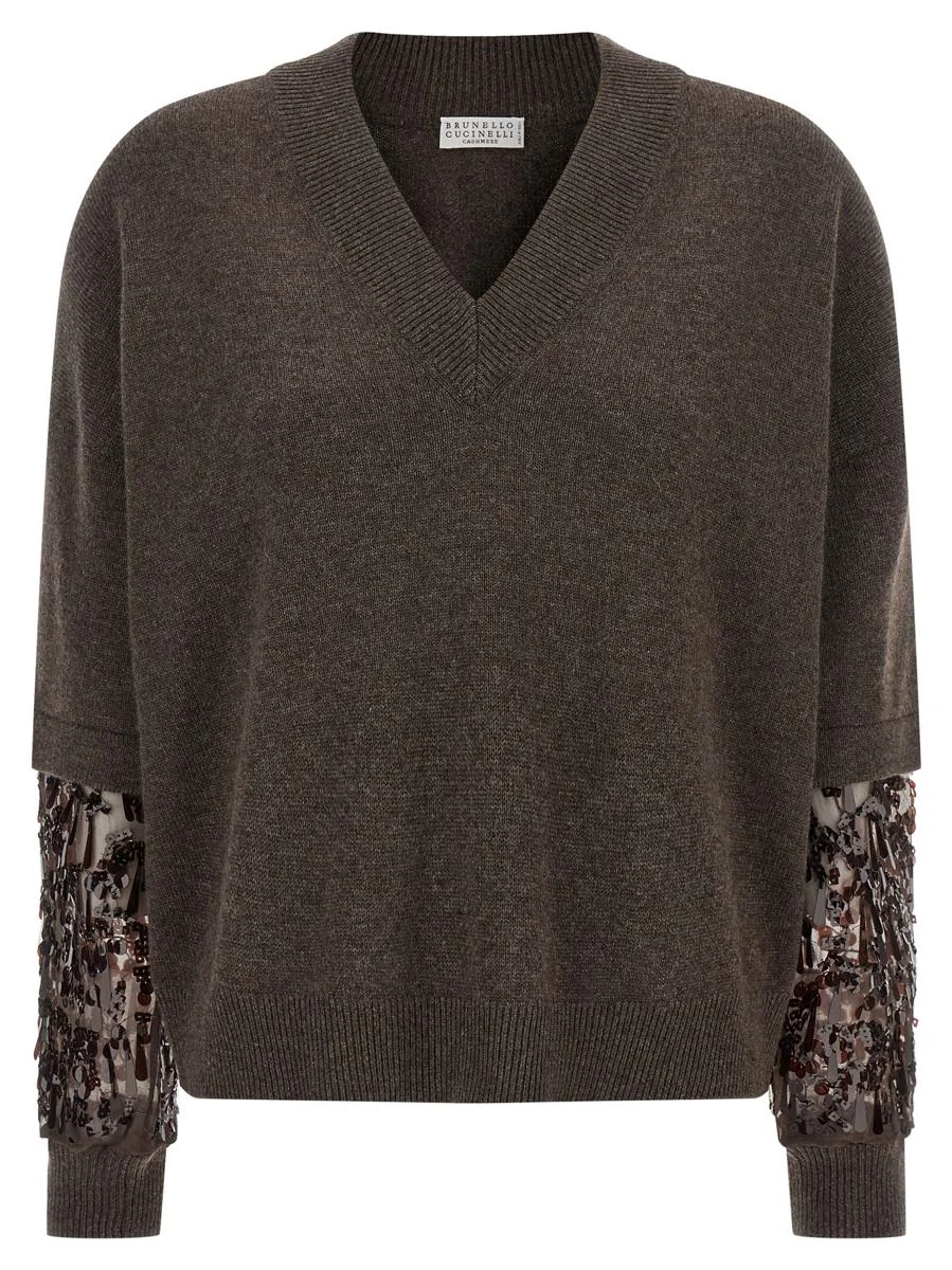 Cashmere sweater with double layer long sleeves with tulle insert with sequin and cuff applique, V-neck Gender: Women Material: 100% CASHMERE Color: BROWN Made in: Italy Product ID: M12730002C2559 *Import tax/duty will be calculated at checkout (If applicable)