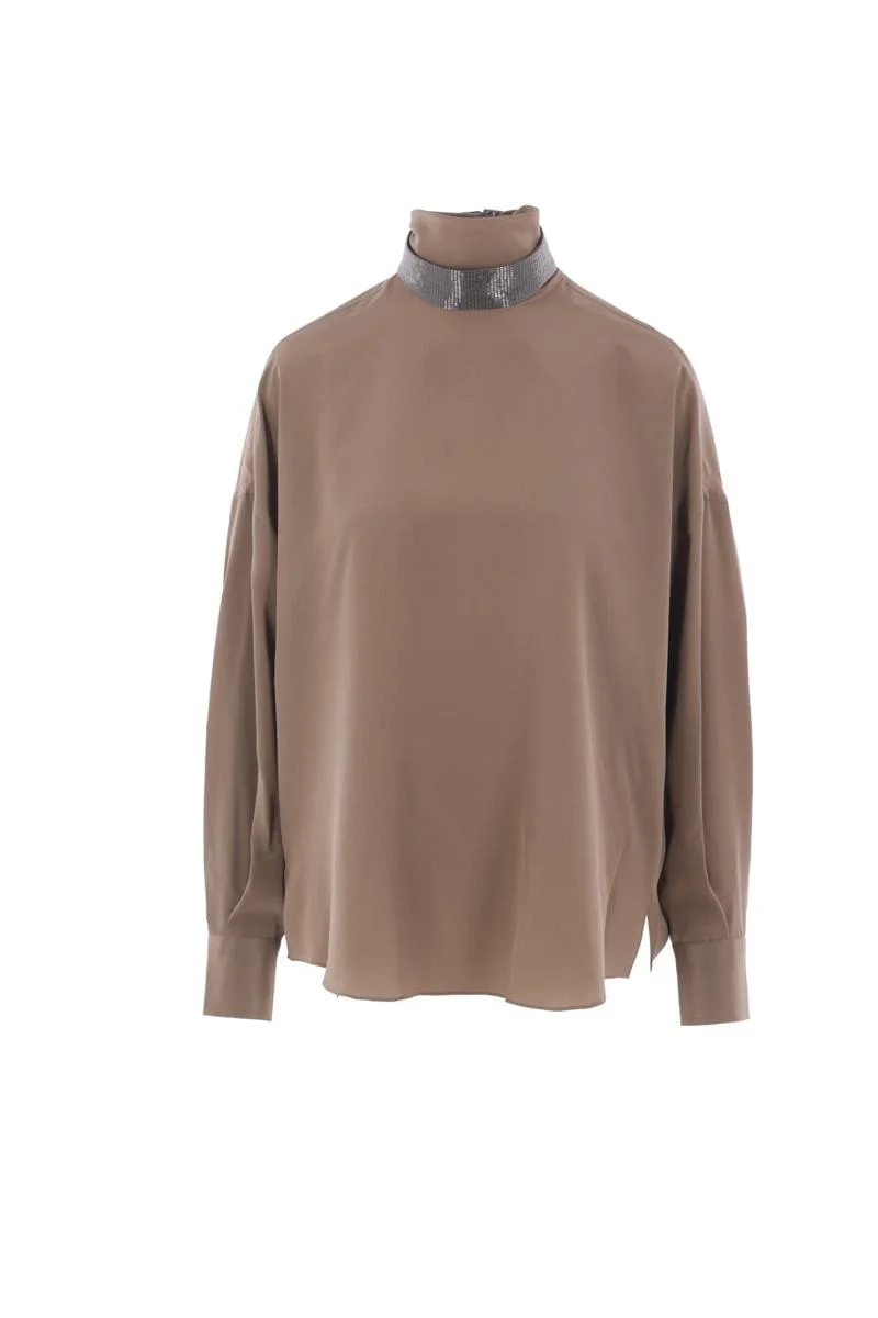 Brunello Cucinelli blouse crafted from mud‑brown silk crepe de chine. Featuring a funnel neck with rear button fastening, long sleeves with buttoned cuffs, and a rounded hem. The design is completed by a removable neck band embroidered with rows of sparkling monili. Gender: Women Material: (TB993) 100%SILK Color: MUD Made in: Italy Product ID: MB993EK724C3981 *Import tax/duty will be calculated at checkout (If applicable)