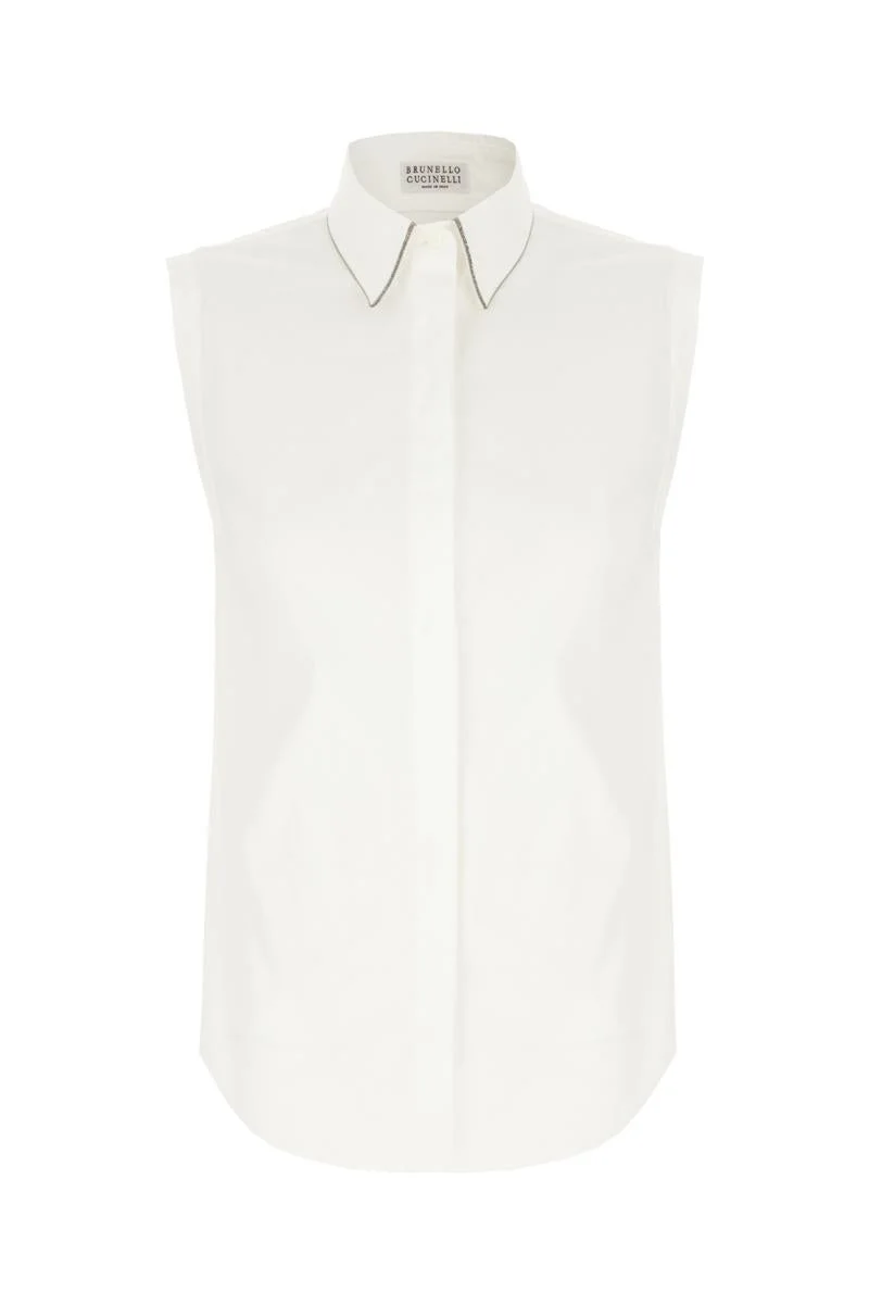 White cotton blend poplin texture beaded trim detail straight-point collar concealed front button fastening sleeveless curved hem Gender: WOMEN Material: COTTON: 72.0%, POLYAMIDE: 23.0%, ELASTANE: 5.0% Color: WHITE Made in: IT Product ID: M0091MA616 C159 *Import tax/duty will be calculated at checkout (If applicable)