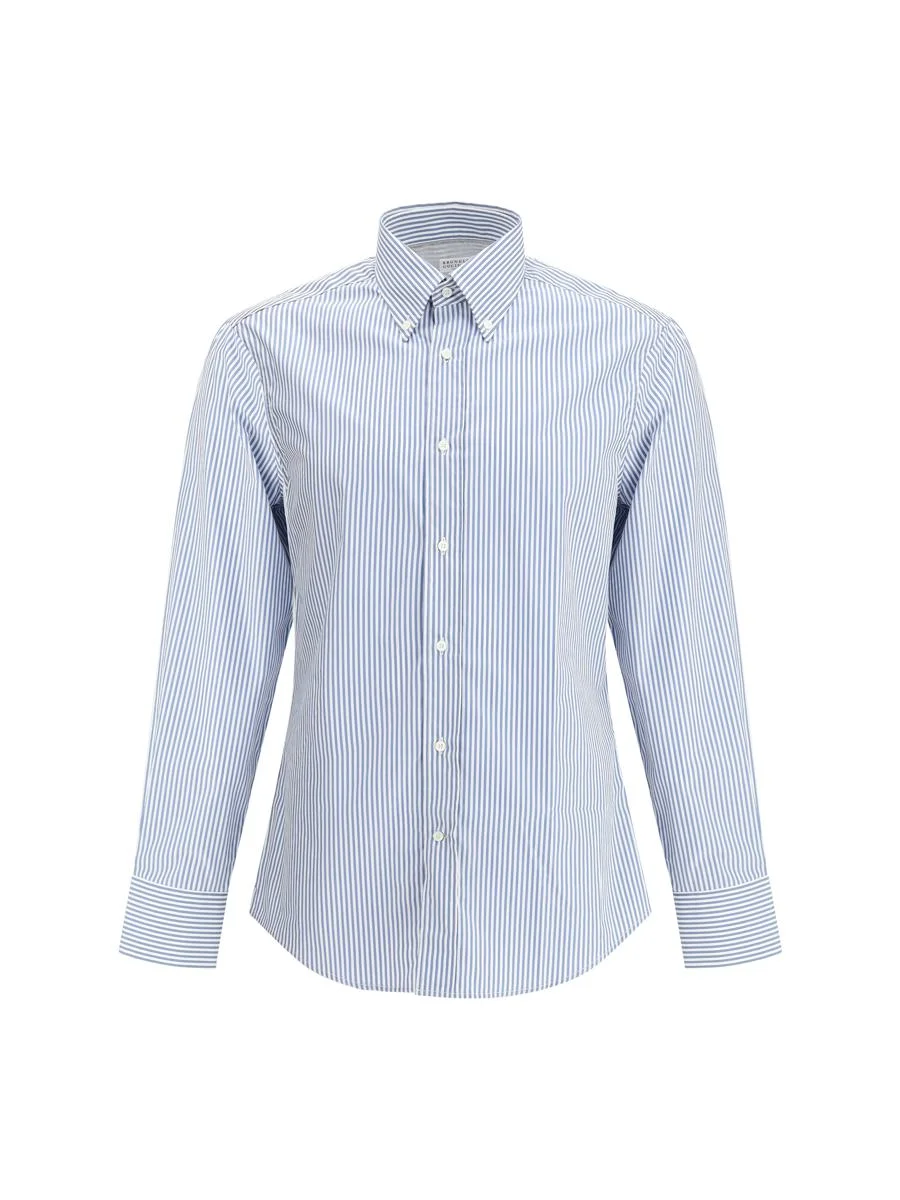 BRUNELLO CUCINELLI'S STRIPED COTTON SHIRT TELLS THE STORY OF TIMELESS ELEGANCE WITH A PERFECT BALANCE OF SARTORIAL TRADITION AND CONTEMPORARY STYLE. THE CUTAWAY COLLAR AND FRONT BUTTON CLOSURE EMPHASIZE PRECISION DETAILING, WHILE THE LONG SLEEVES WITH BUTTONED CUFFS AND ROUNDED HEM CREATE A FLUID AND HARMONIOUS SILHOUETTE. THE VERTICAL STRIPE PATTERN LENDS MOVEMENT TO THE FABRIC, TRANSFORMING AN ESSENTIAL GARMENT INTO A DISTINCTIVE ELEMENT OF ANY REFINED WARDROBE. STANDARD Gender: Men Material: COTTON Color: BLUE Made in: Imported Product ID: MY6491716_C044 *Import tax/duty will be calculated at checkout (If applicable)