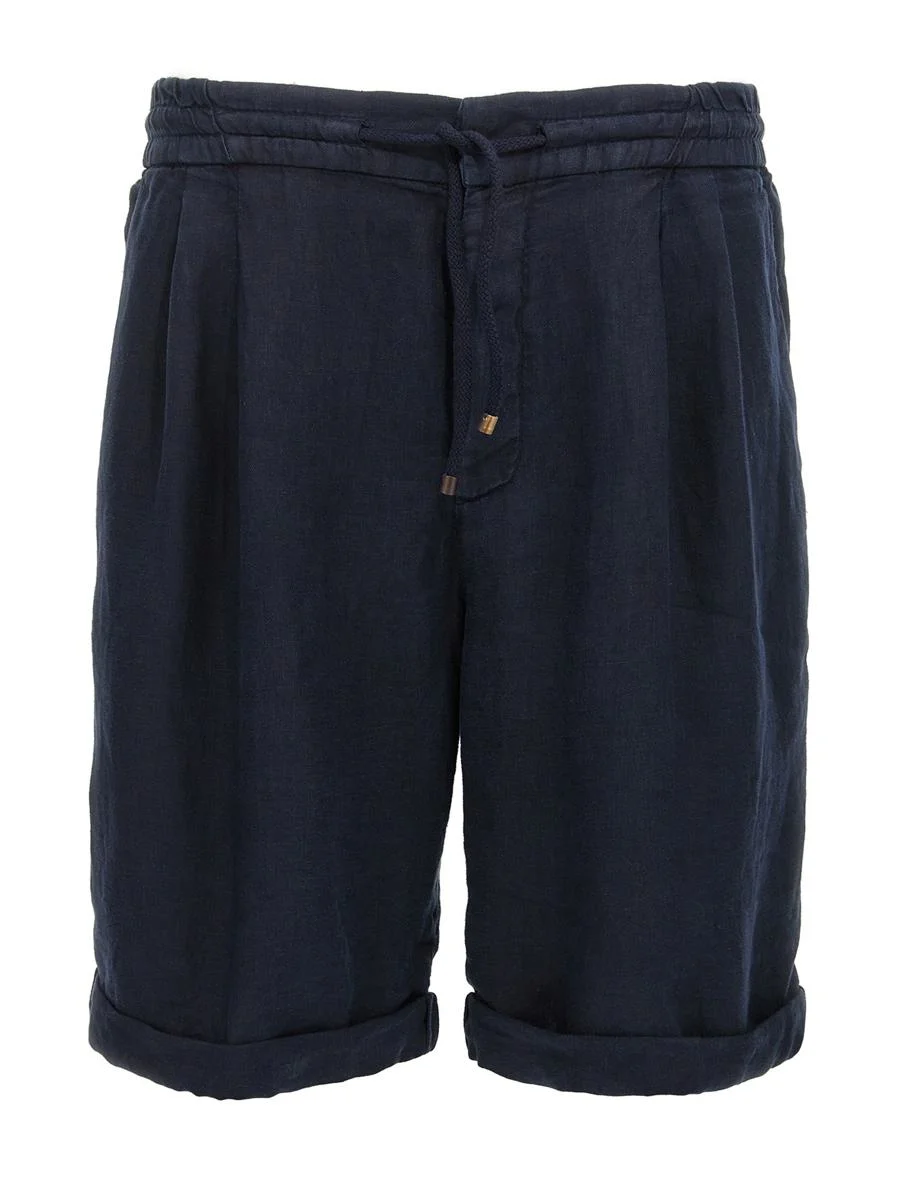 Brunello Cucinelli shorts made of blue linen gabardine. Featuring an elasticated waistband with a drawstring, front closure with hook/zip, multiple pockets, double front pleats and a cuff at the hem. Gender: Men Material: 100%LINEN Color: BLUE Made in: IT Product ID: M243DU0020C2517 *Import tax/duty will be calculated at checkout (If applicable)