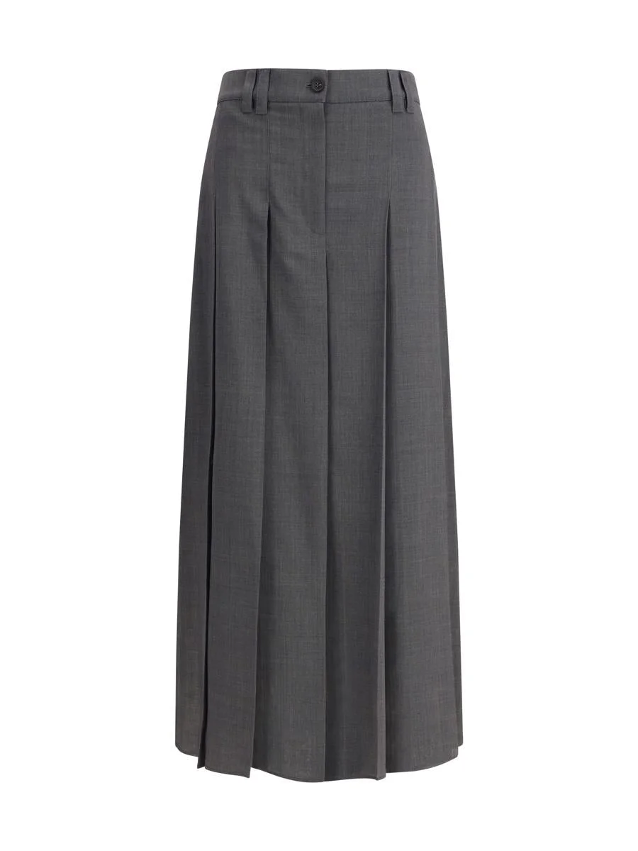 THE PLEATED LONG SKIRT IN TECHNO VIRGIN WOOL GAUZE BY BRUNELLO CUCINELLI STANDS OUT FOR ITS USE OF FINE MATERIALS AND TASTEFUL DETAILS. THE LIGHTWEIGHT FABRIC ENHANCES THE WIDE PLEATING THAT RUNS ALONG THE ENTIRE LENGTH OF THE MODEL, GIVING FLUIDITY AND MOVEMENT. THE ZIPPER AND COUNTER-BUTTON CLOSURE, ALONG WITH THE BACK WELT POCKET, RECALLS THE MASCULINE SARTORIAL WORLD, WHILE THE SLIT BOTTOM EMPHASIZES THE FEMININITY OF THE SILHOUETTE. TO COMPLETE THE STYLE, THE REFINED JEWEL DETAIL GIVES AN UNMISTAKABLE LUMINOUS NOTE, EMBLEM OF BRUNELLO CUCINELLI ELEGANCE. RTW IT Gender: Women Material: POLYESTER | FLEECE WOOL Color: GREY Made in: Italy Product ID: MP087G3864_C2164 *Import tax/duty will be calculated at checkout (If applicable)