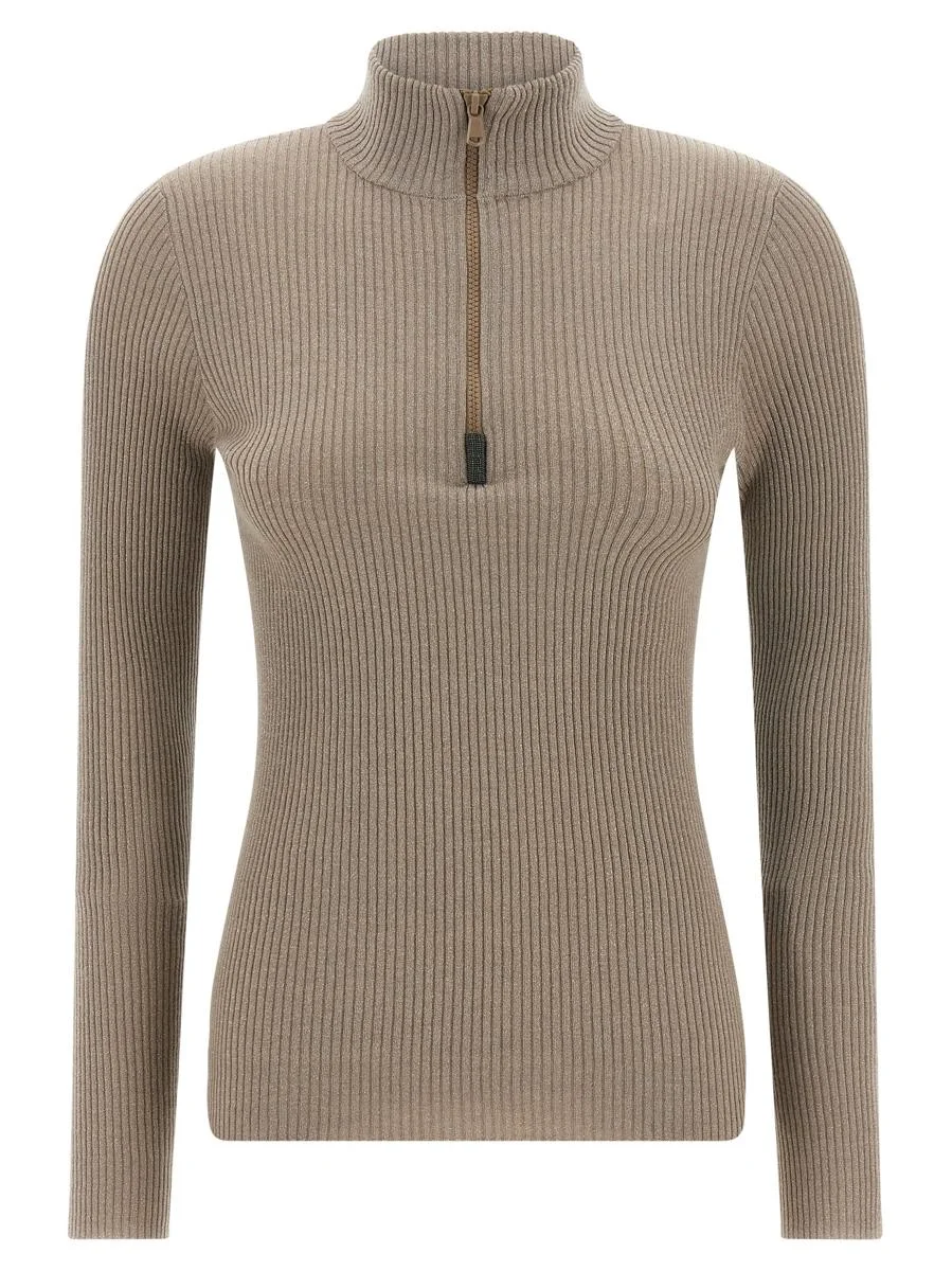 Sparkling ribbed lightweight stretch cashmere knit turtleneck sweater with half zip with Monile detail, high neck, long sleeves Gender: Women Material: 51% CASHMERE 22% SILK 20% POLYAMIDE 7% PM Color: Beige Made in: Italy Product ID: M41844604C9729 *Import tax/duty will be calculated at checkout (If applicable)