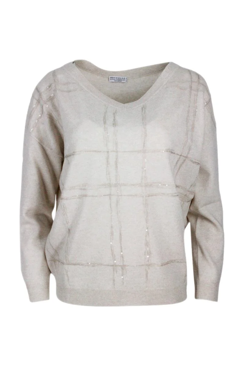 Lightweight v-neck long-sleeved oversized sweater with window motif embellished with micro-sequins in cashmere blend Gender: Women Material: 60% WOOL 30% CASHMERE 10% SILK Color: AVENA Made in: IT Product ID: M16135902.C8718 *Import tax/duty will be calculated at checkout (If applicable)